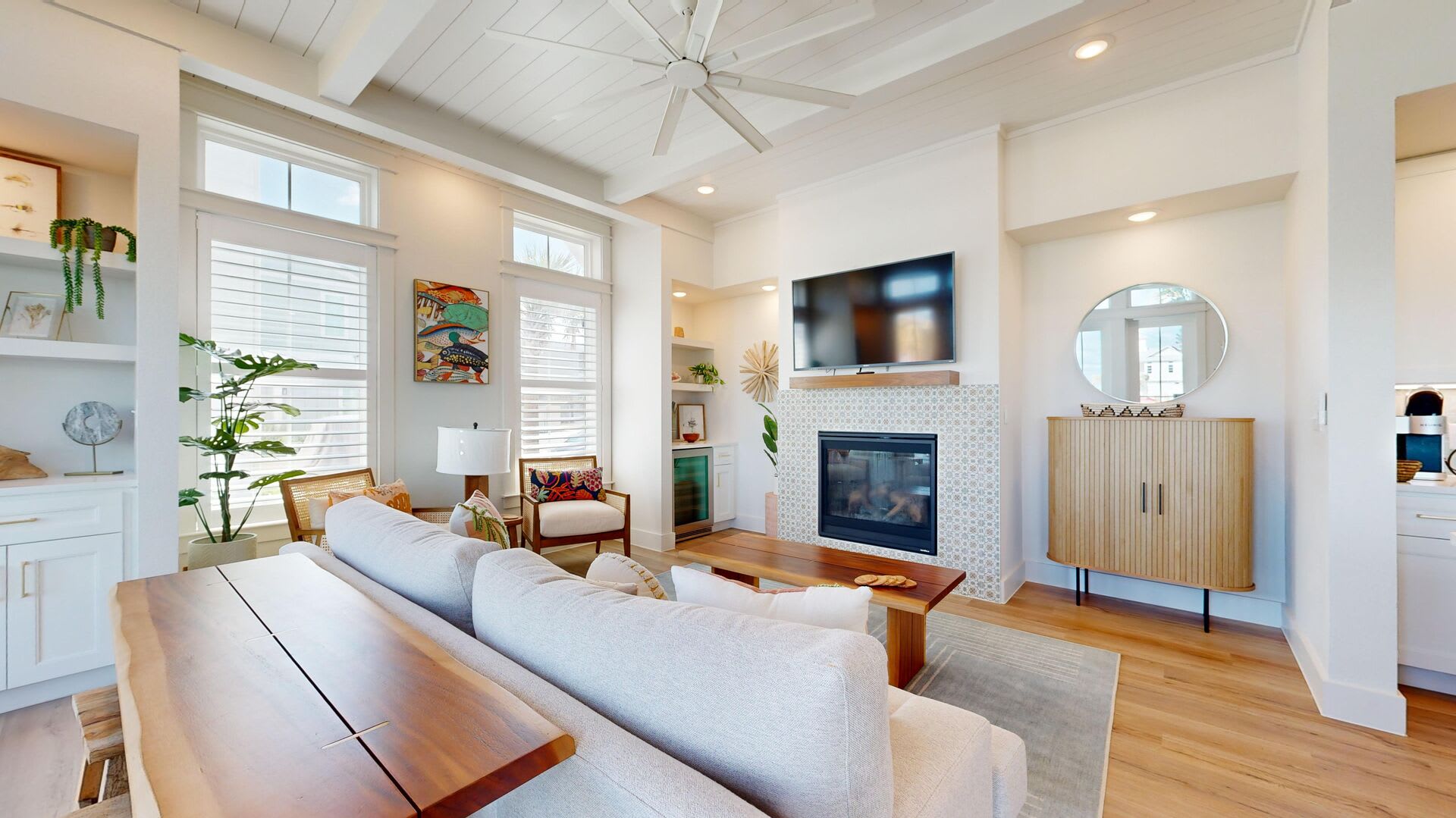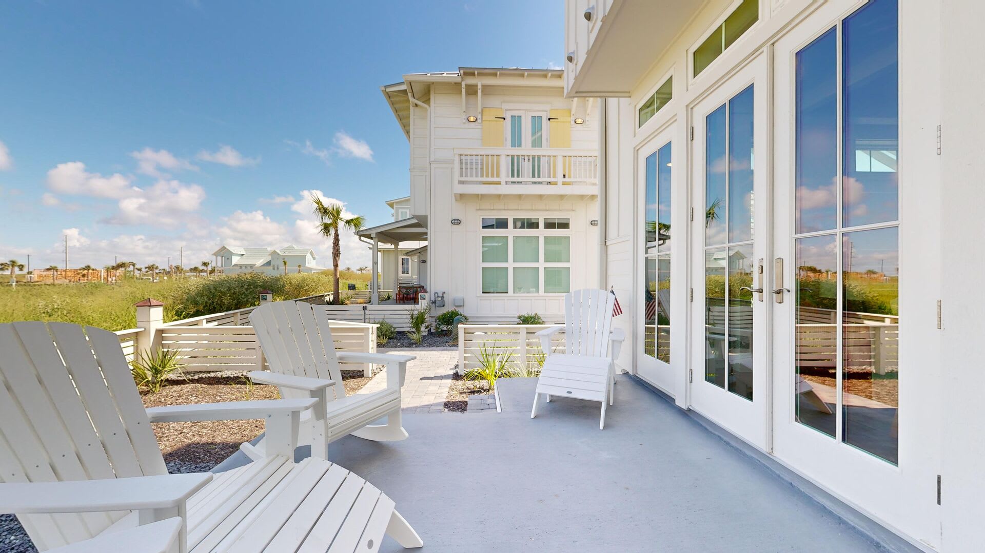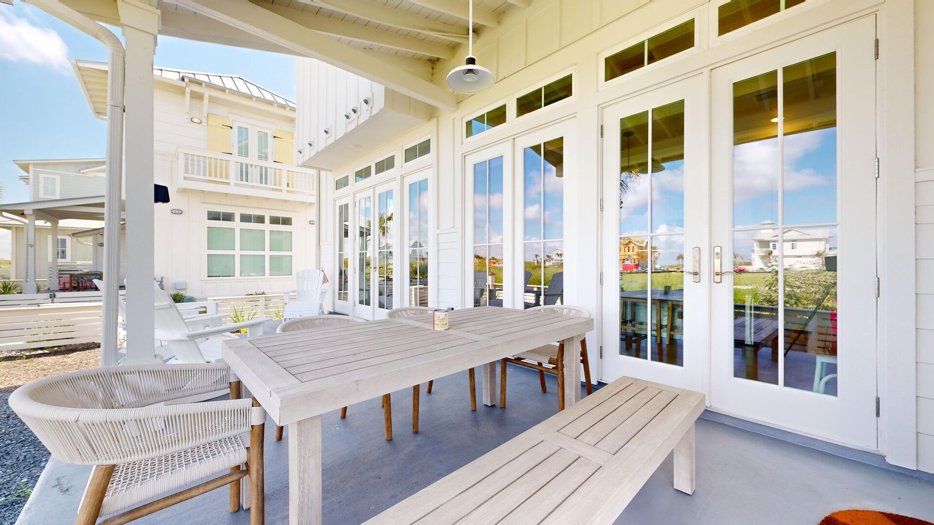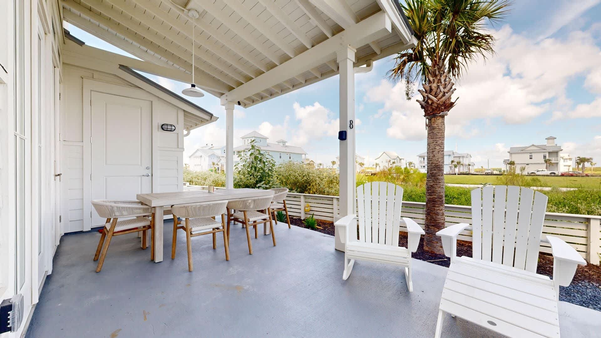 Venture outdoors to the covered patio, where you'll find a dining table and lounge chairs, perfect for soaking up the sun or enjoying an evening under the stars.