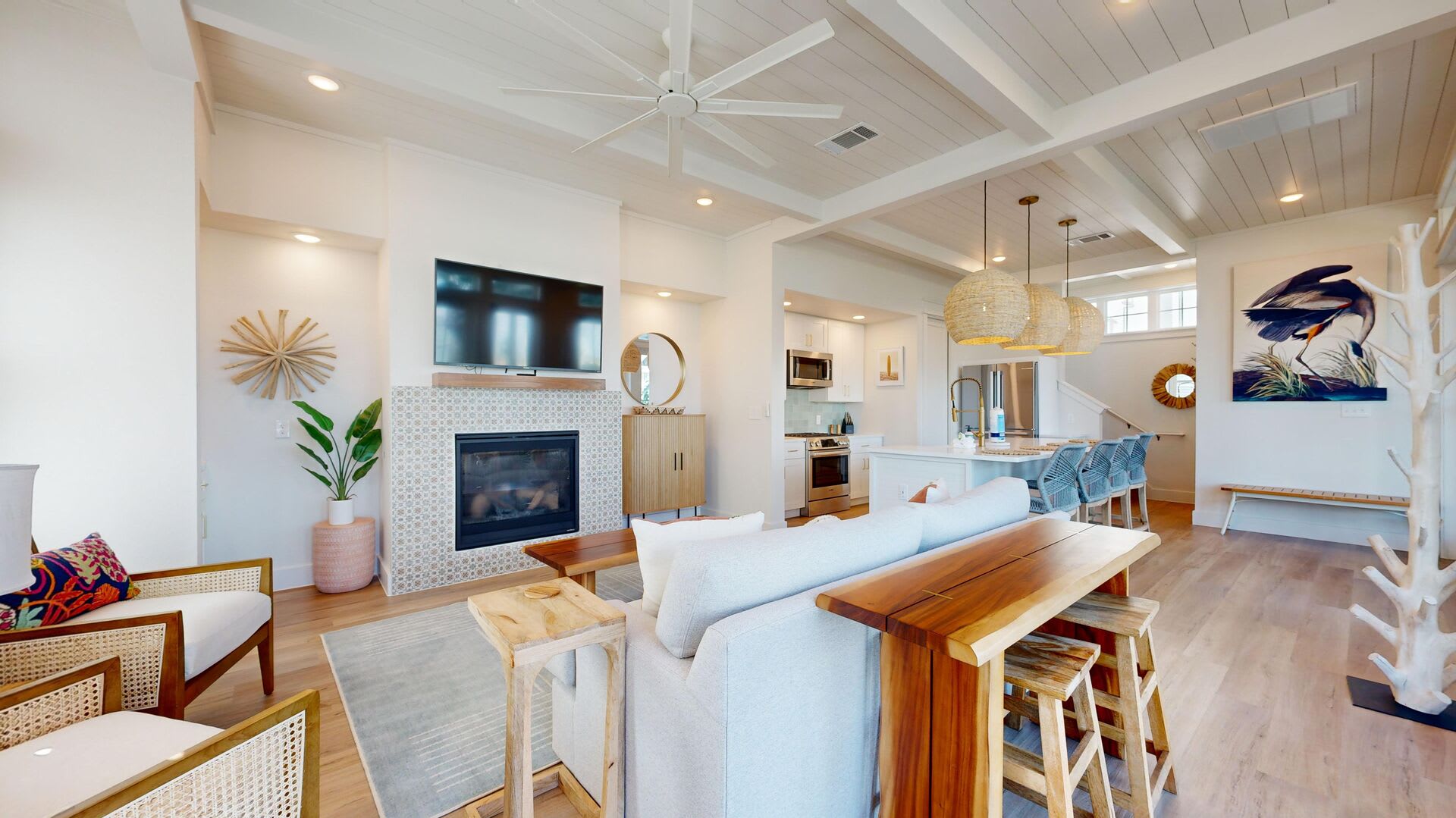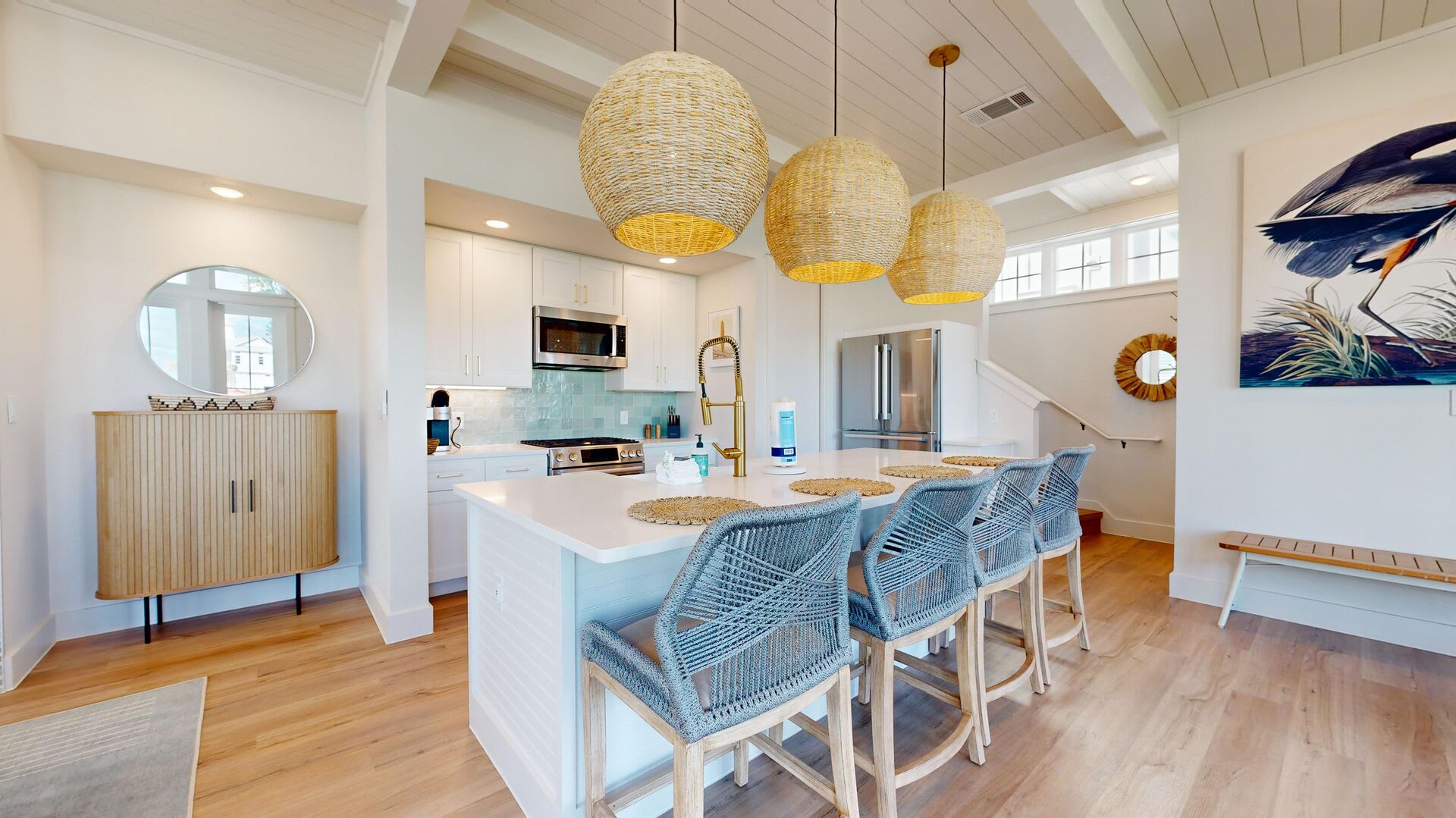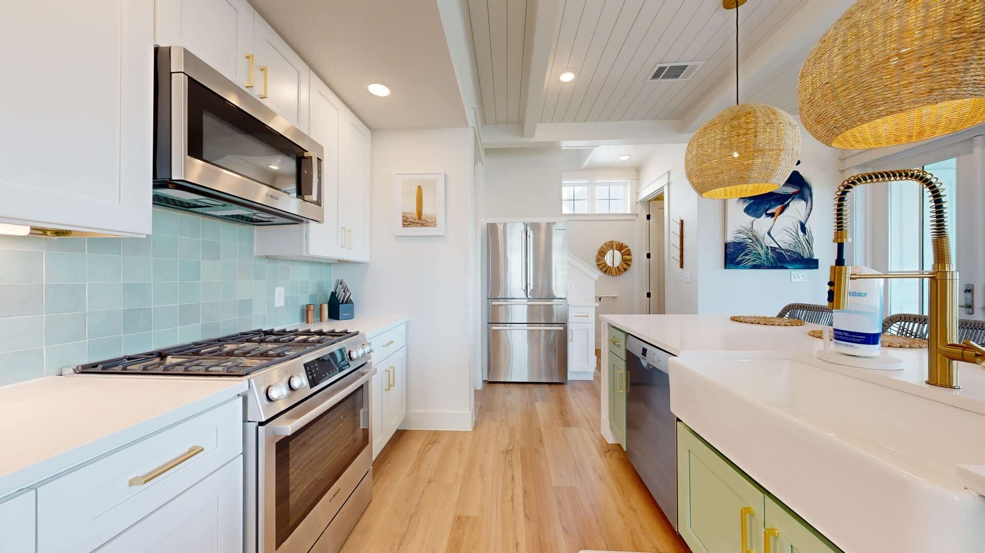 Step inside to discover a well-lit, open floor plan that seamlessly combines the kitchen, living area, and an oversized island that doubles as a dining table. The fully stocked kitchen boasts sleek stainless steel appliances, making meal preparation a breeze. A convenient half bath is located downstairs for guests.