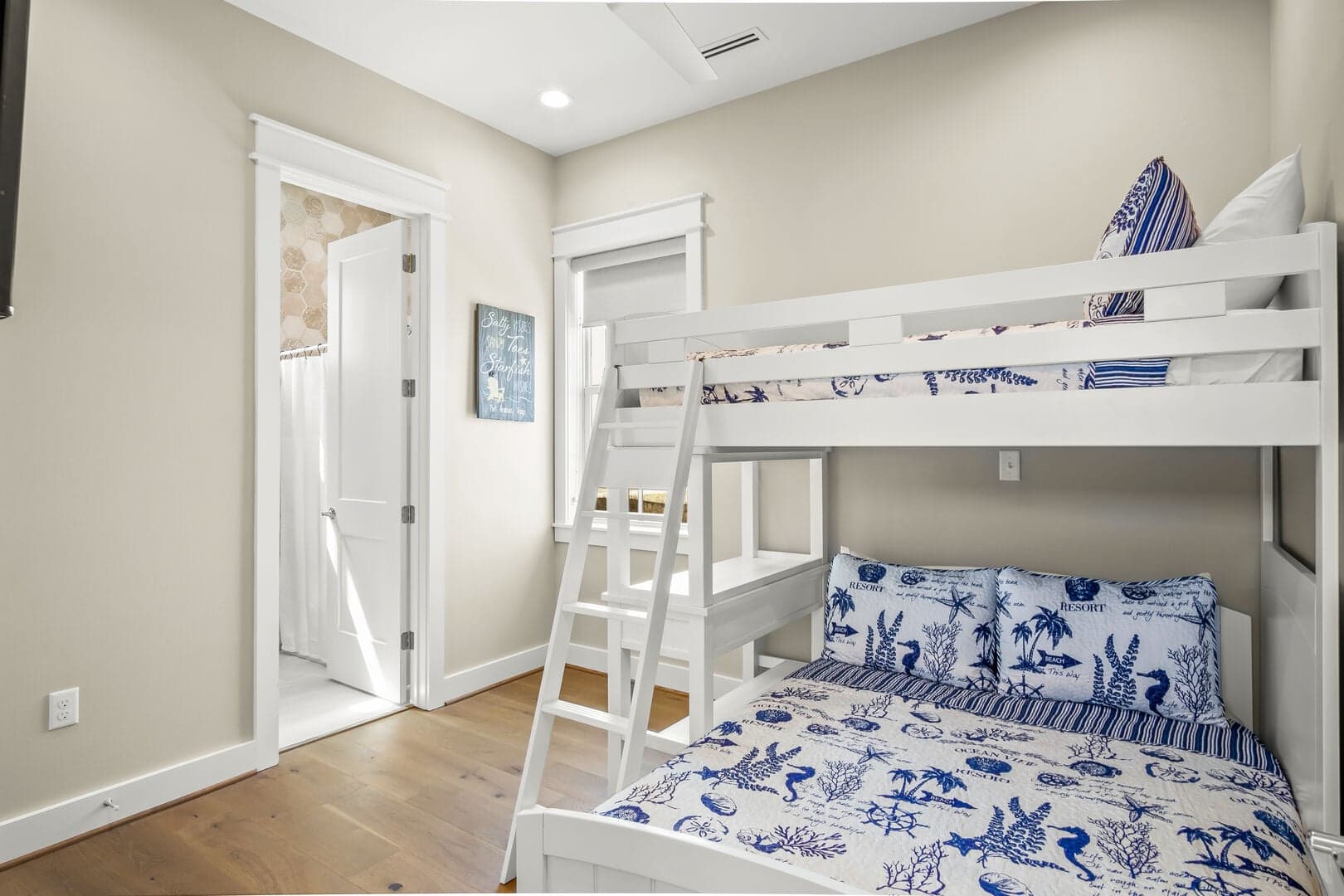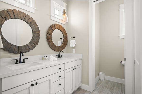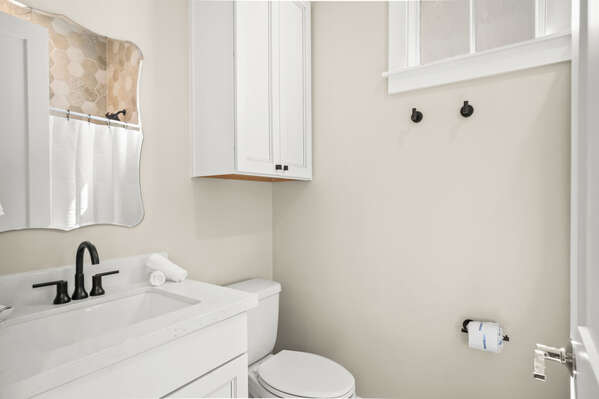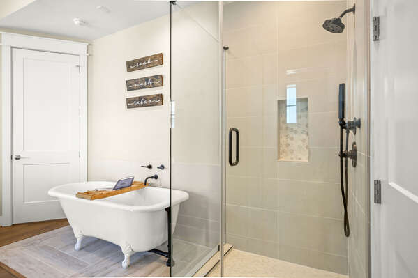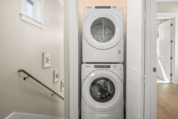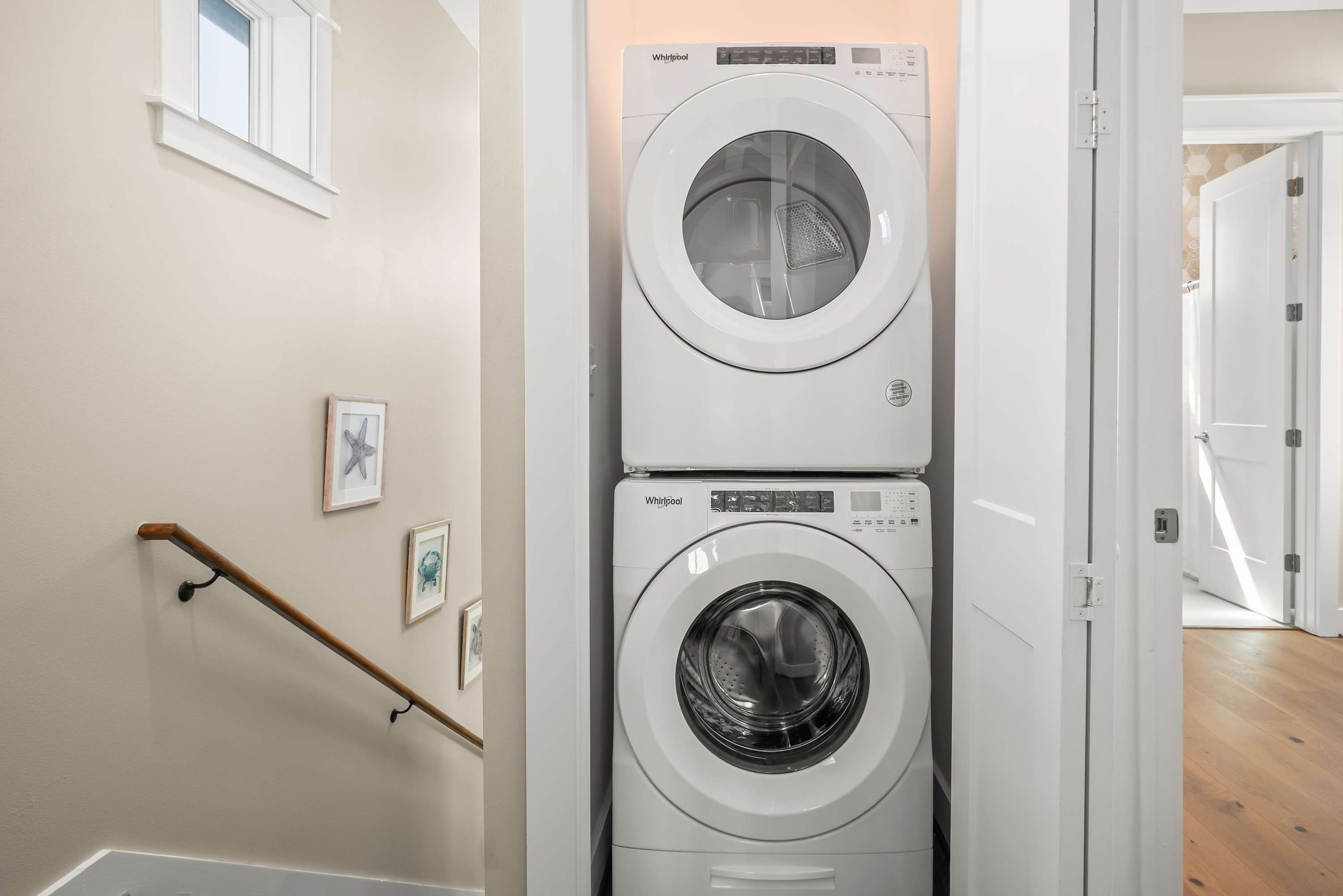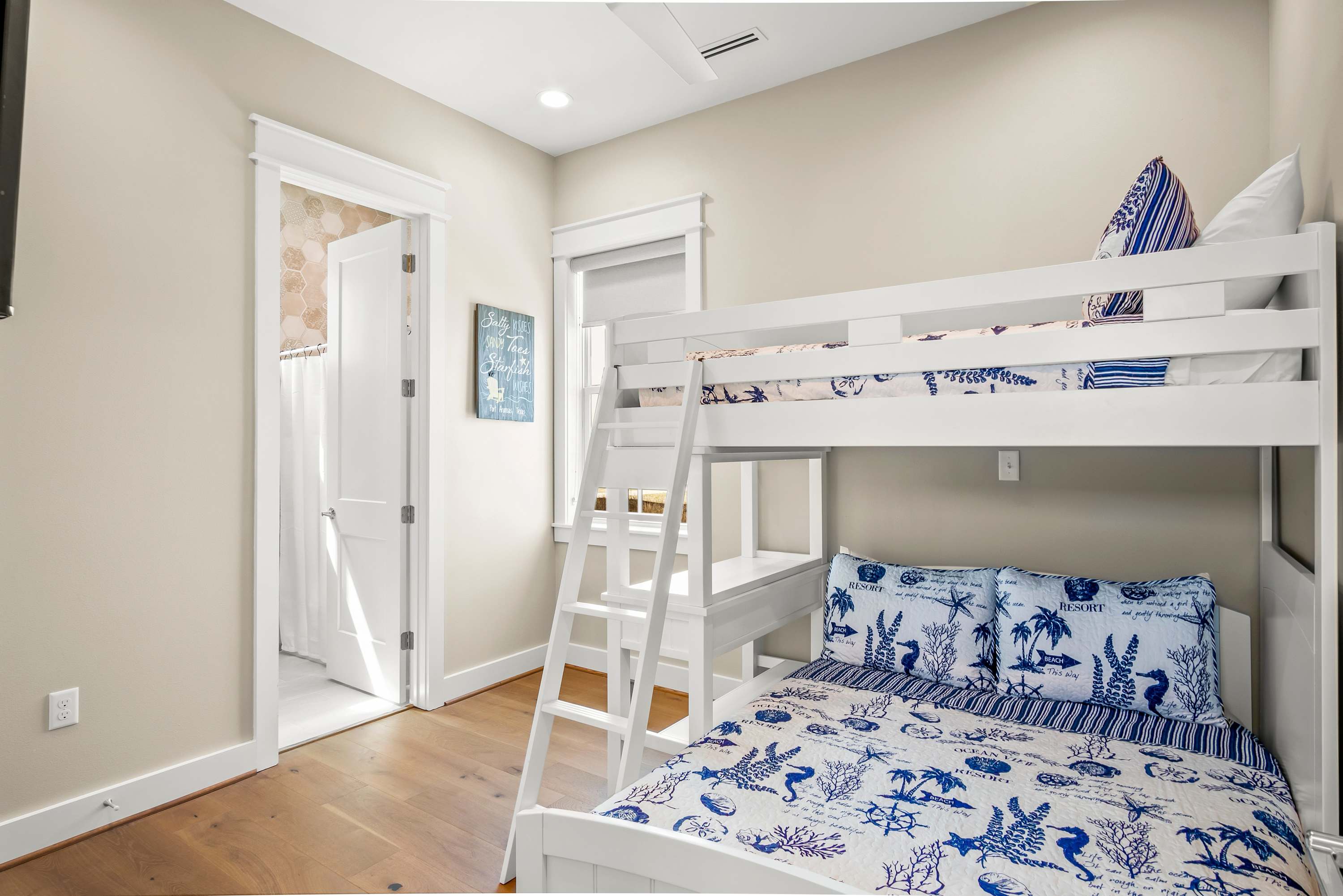 After a fun-filled day exploring the best of Port A, head upstairs to Sea'n Stars two spacious bedrooms. You’ll fall in love with the primary suite! Boasting a plush, king-size bed, private balcony, and walk-through ensuite bathroom, it’s sure to delight. Discover dual sinks, a large walk-in shower, and gorgeous claw-footed soaking tub in the primary bathroom. The guest bedroom offers comfort for kids and adults alike with a twin-over-queen-size bunk bed and a private ensuite bathroom. You’ll appreciate having Smart TVs and closet space in both bedrooms. No need to overpack for your vacation. This beach vacation house provides you with an in-house washer and dryer, so you can save space in your luggage for souvenirs!