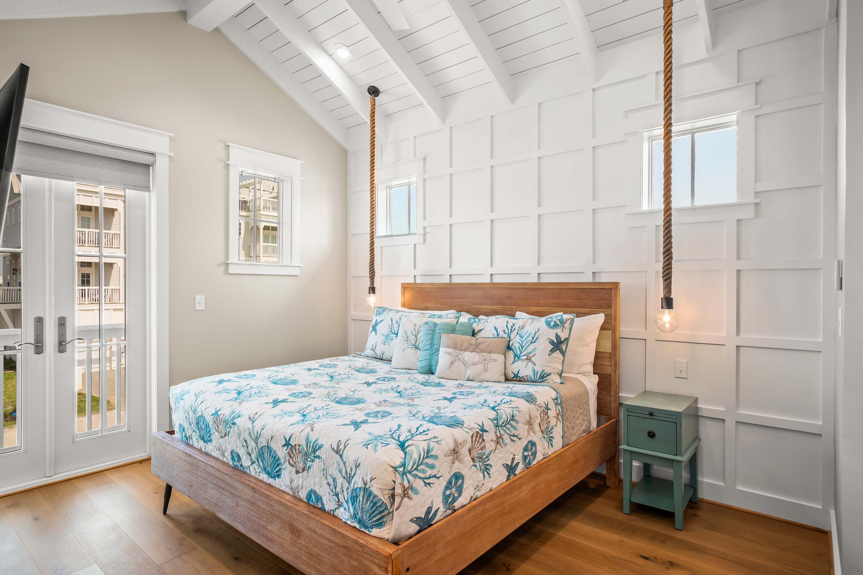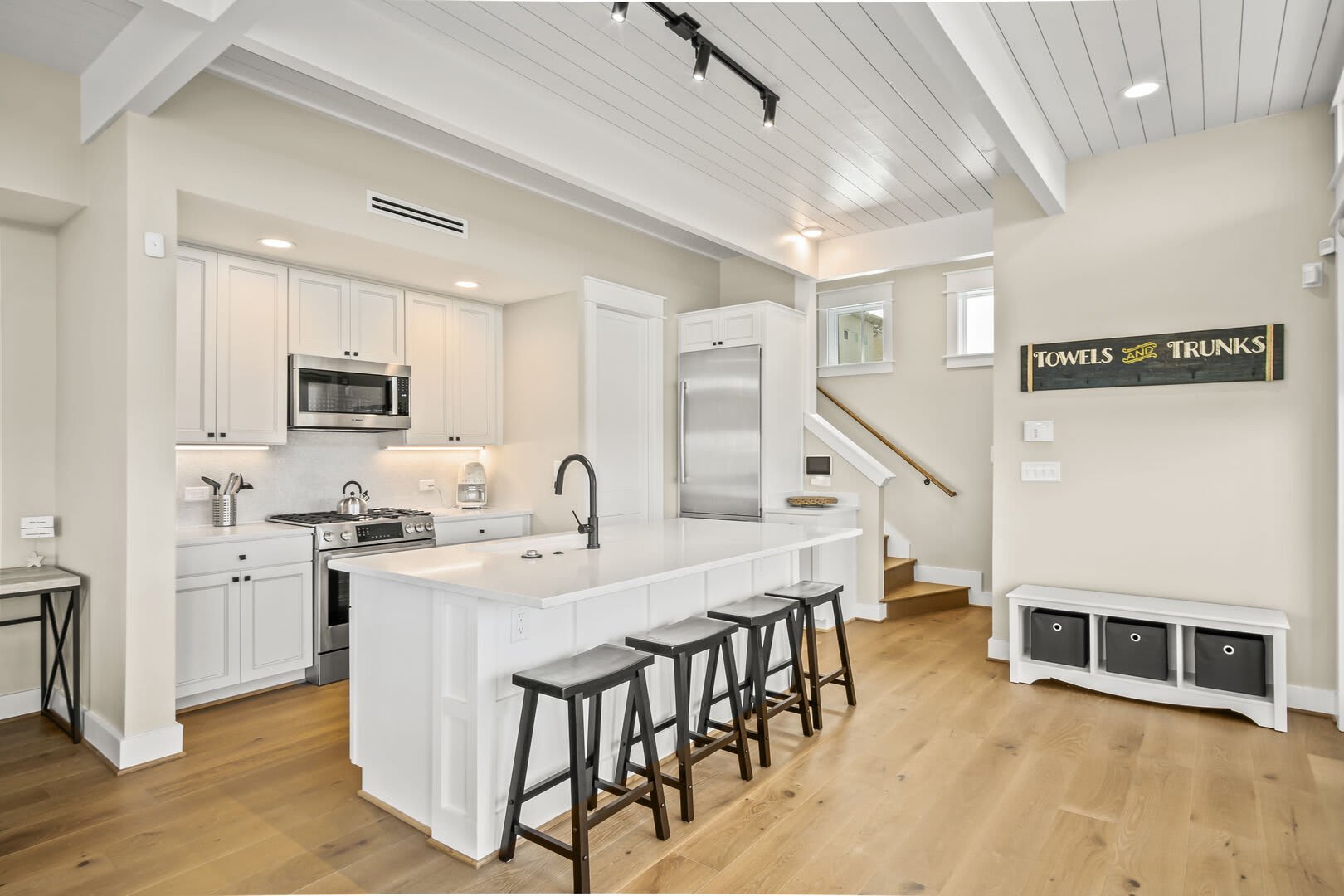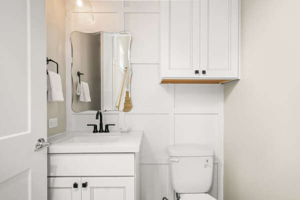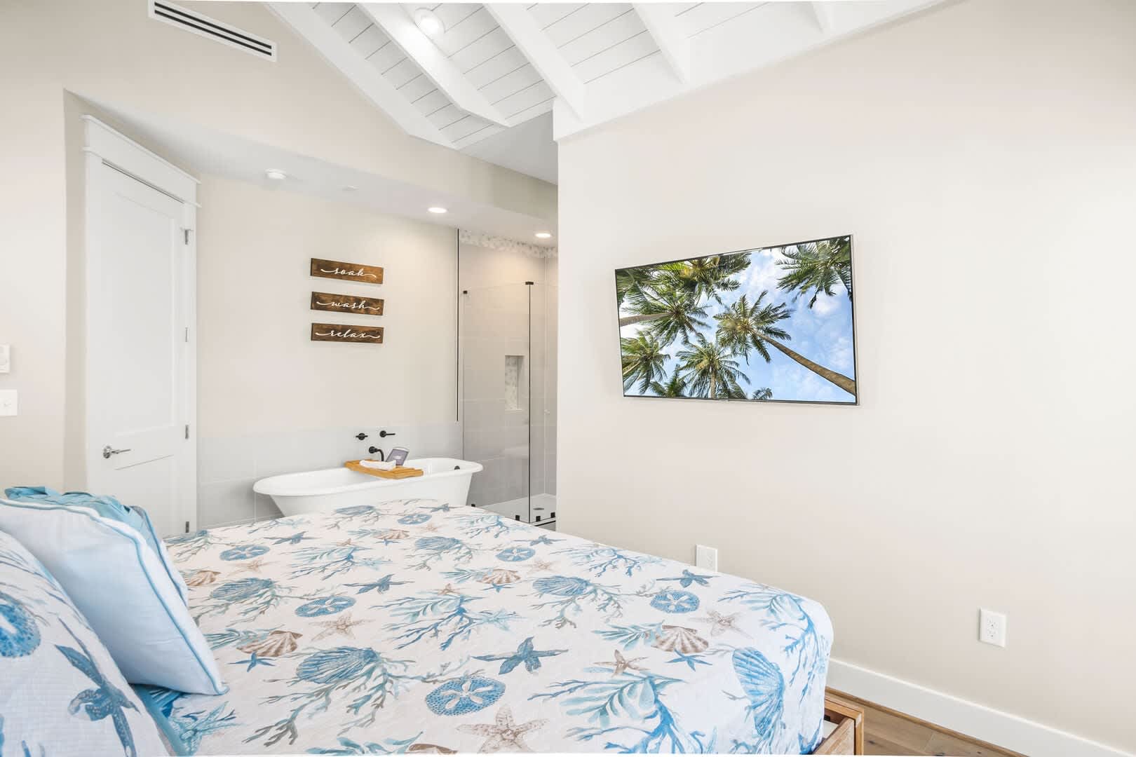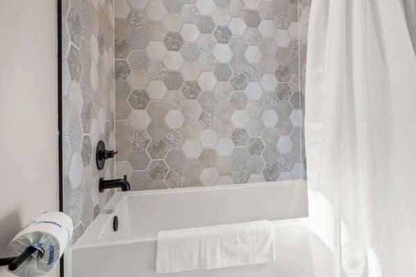 After a fun-filled day exploring the best of Port A, head upstairs to Sea'n Stars two spacious bedrooms. You’ll fall in love with the primary suite! Boasting a plush, king-size bed, private balcony, and walk-through ensuite bathroom, it’s sure to delight. Discover dual sinks, a large walk-in shower, and gorgeous claw-footed soaking tub in the primary bathroom. The guest bedroom offers comfort for kids and adults alike with a twin-over-queen-size bunk bed and a private ensuite bathroom. You’ll appreciate having Smart TVs and closet space in both bedrooms. No need to overpack for your vacation. This beach vacation house provides you with an in-house washer and dryer, so you can save space in your luggage for souvenirs!