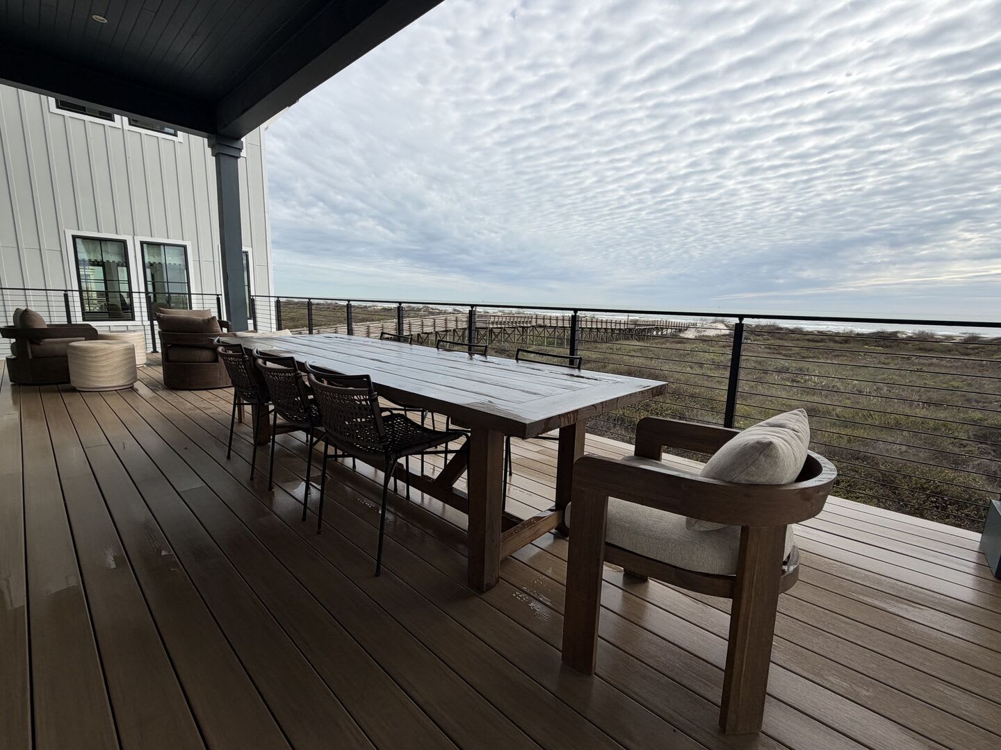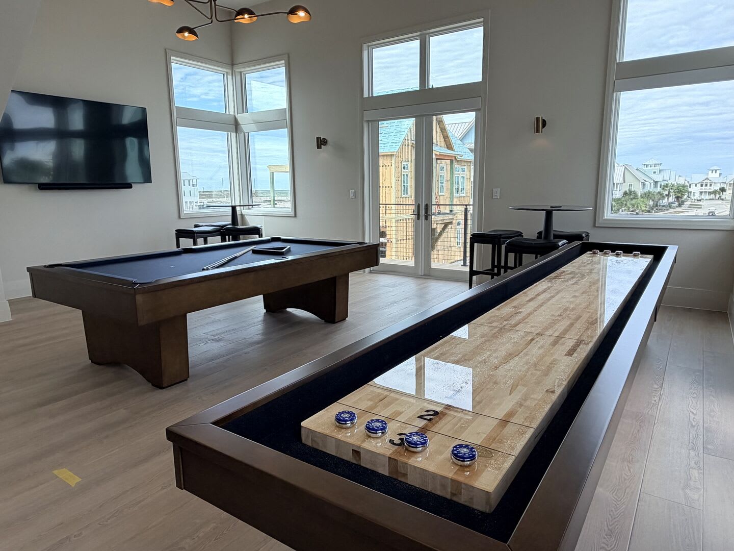 Adjacent to the living area, the vibrant game room is ideal for fun-filled evenings, complete with a pool table and shuffleboard table, along with a private balcony that invites you to unwind and soak in the coastal breeze.