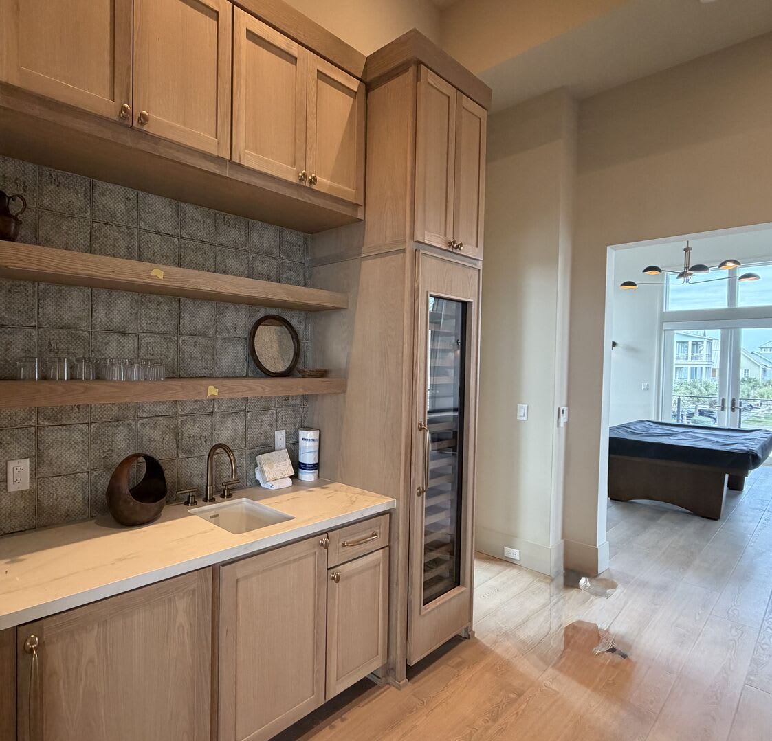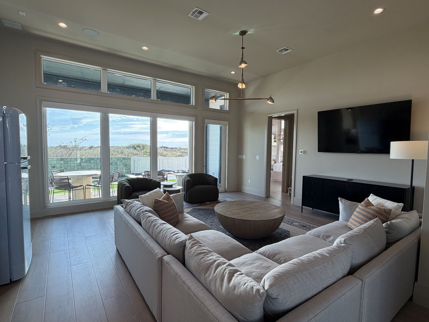 The open-concept living area is designed for entertaining, featuring a pass-through bar with an extra-large wine and beverage fridge, ensuring you're always ready to host gatherings.