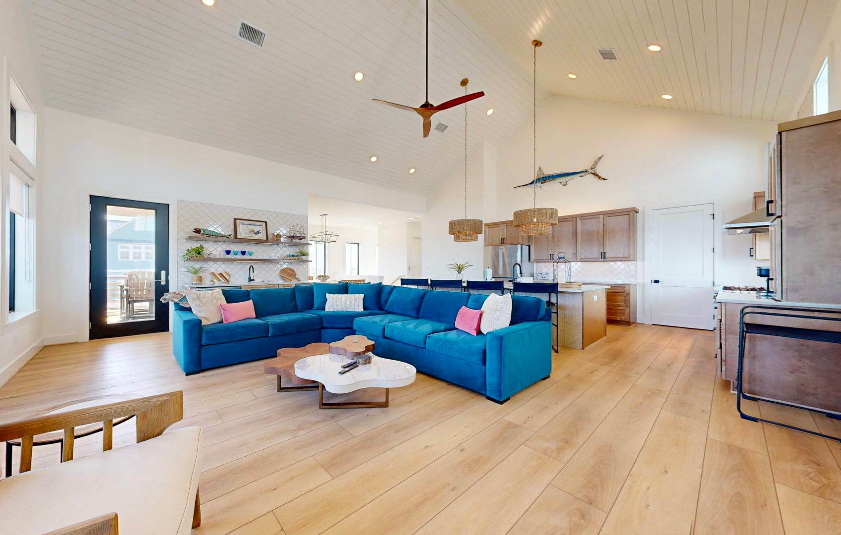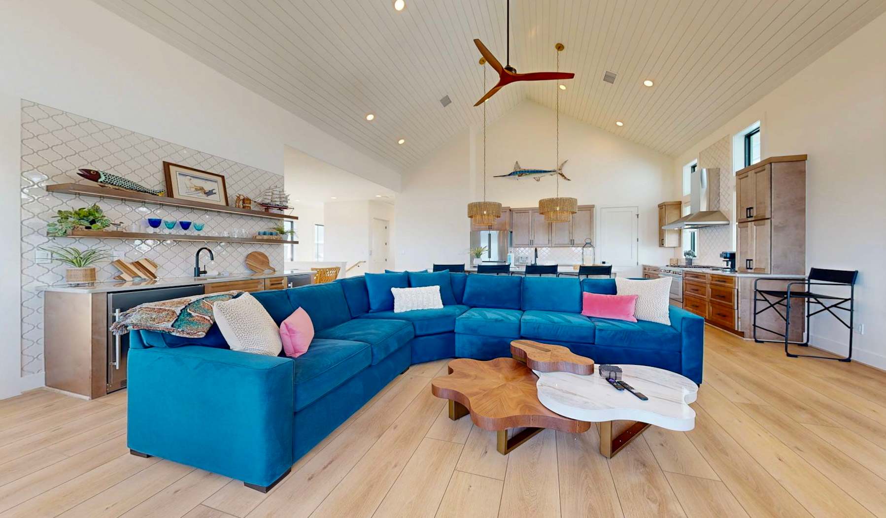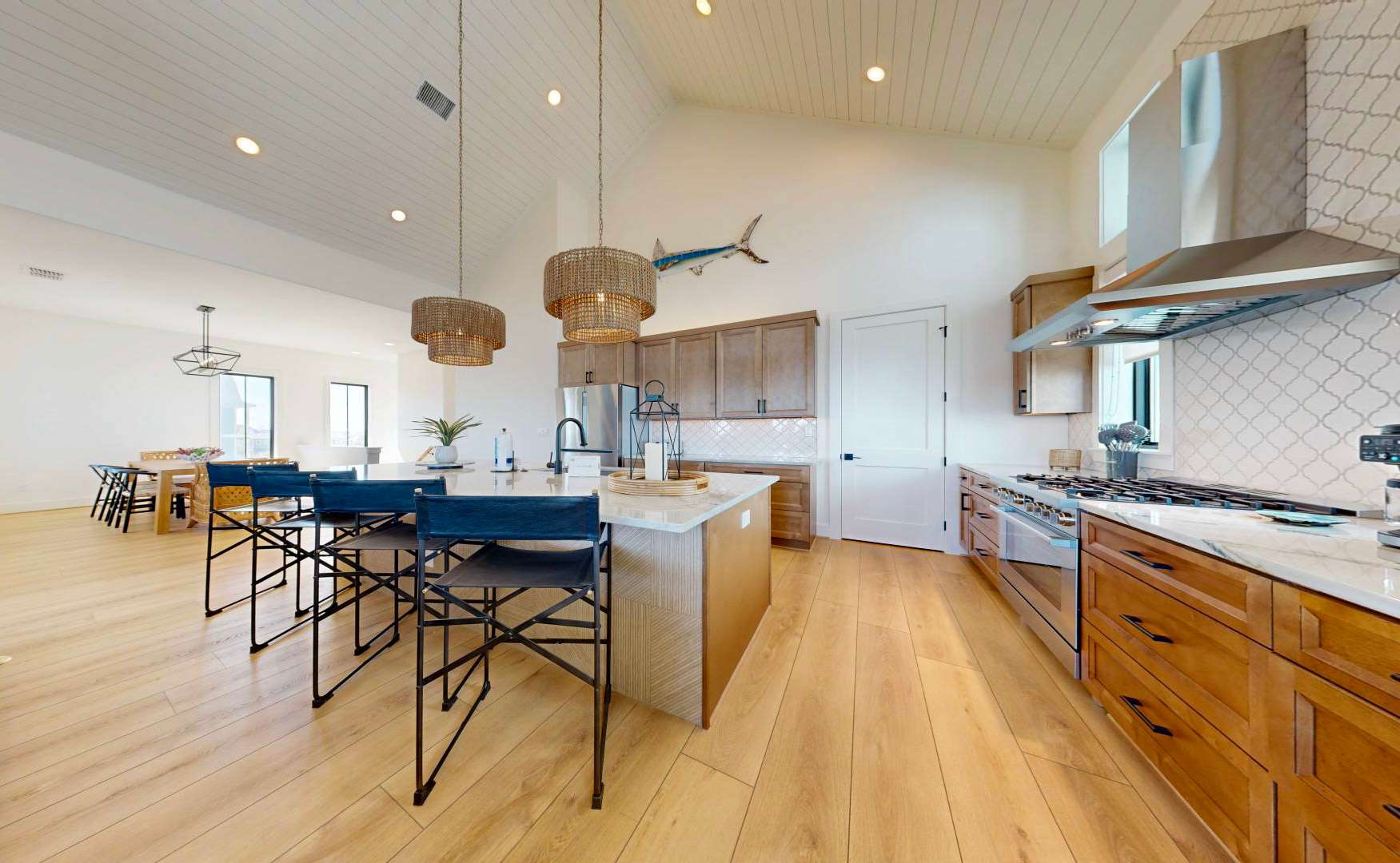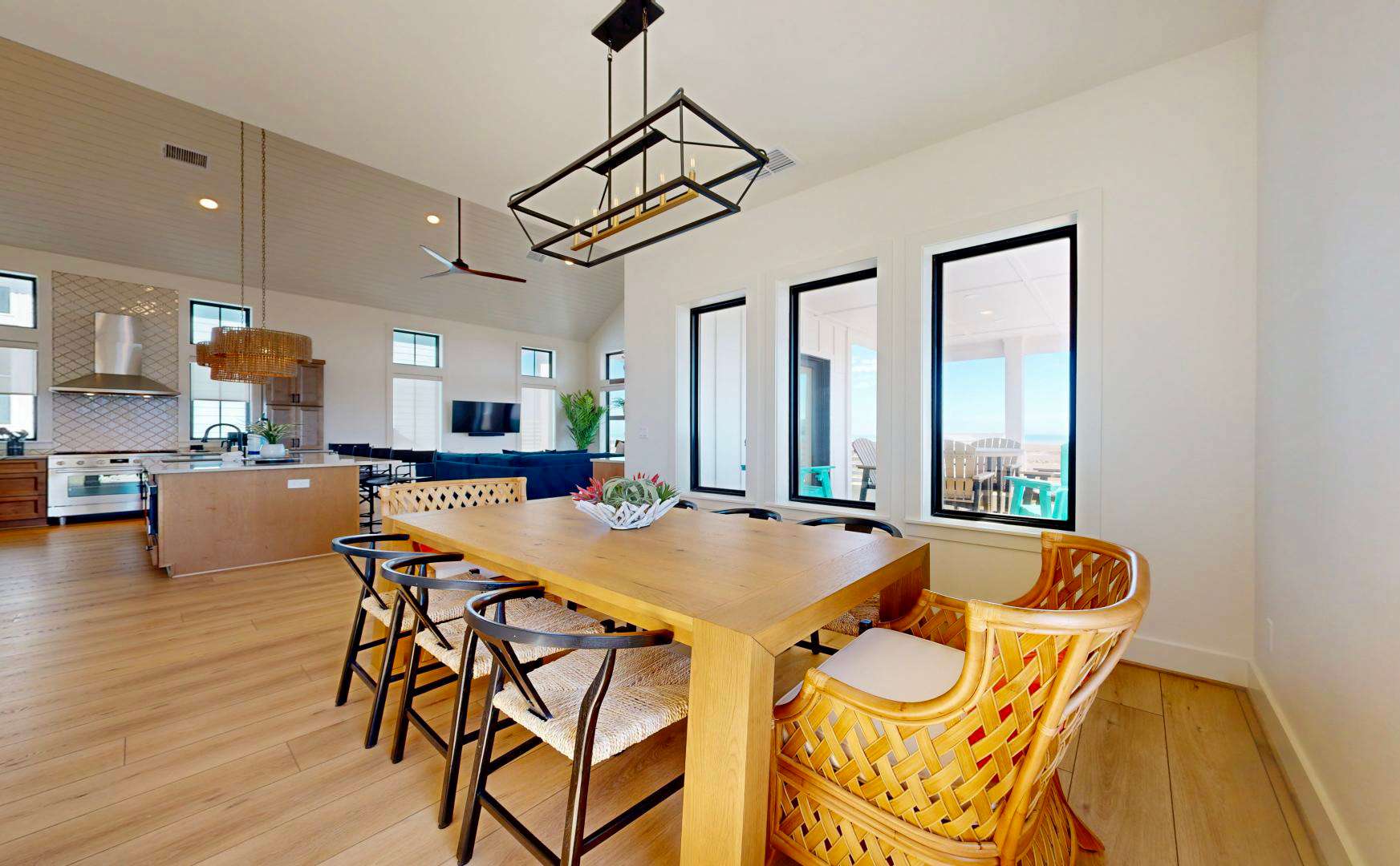 Ascend to Level Three, where the main living area captivates with its expansive open floor plan. Relax in the inviting living space, furnished with a sectional sofa and additional seating, perfect for gatherings. The stylish bar area boasts an ice maker and beverage fridge, ensuring you have everything you need for entertaining. The fully stocked kitchen is a chef's dream, featuring stainless Bosch appliances, abundant counter space, and a large island for meal prep and socializing. The spacious dining table is perfect for family meals or game nights, with extra seating available at the kitchen island.