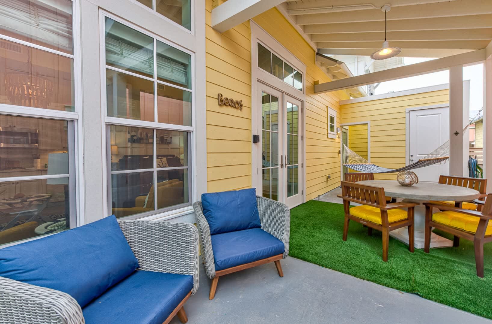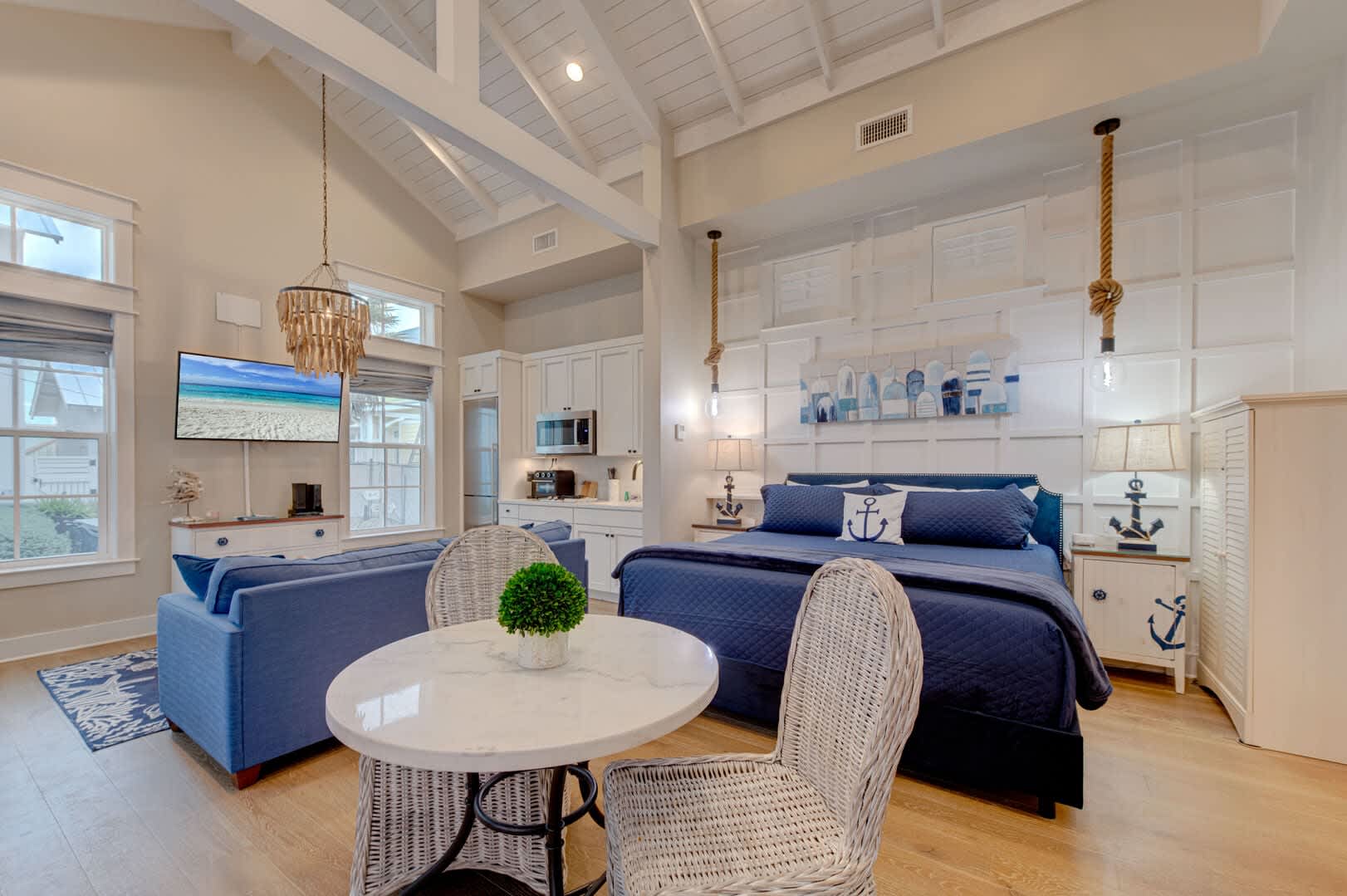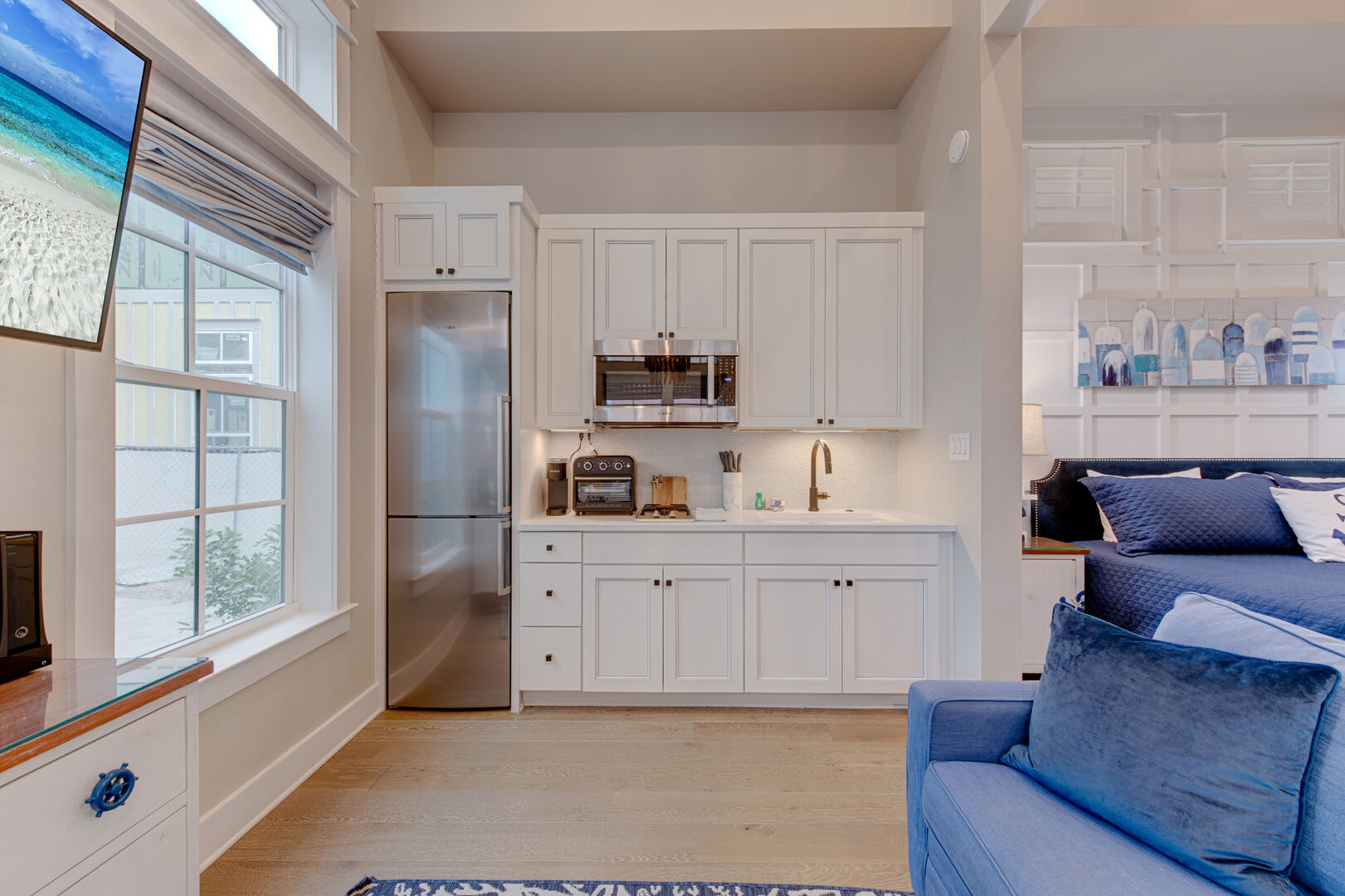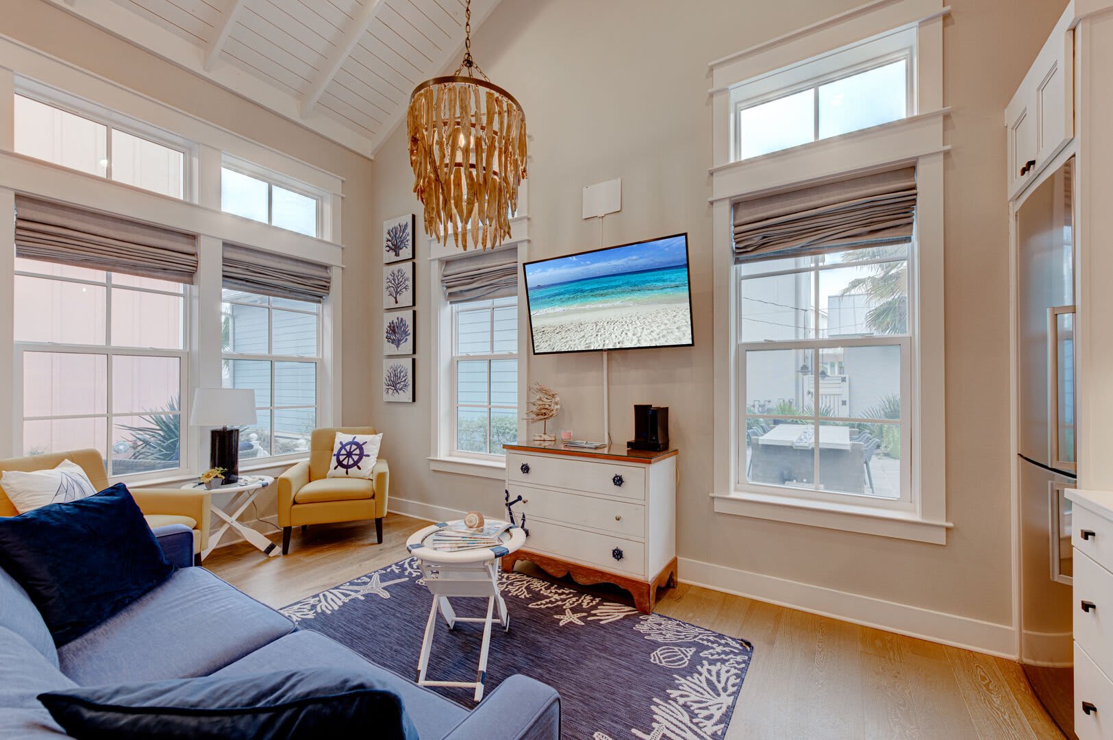 As soon as you step inside, you’ll find unique architectural details with fun, beachy décor. The open floor plan boasts stylish furnishings, great natural light, and all the comforts of home. The kitchenette features a gas stove, refrigerator, microwave, and a drip coffee maker that also accepts K-cups. Slip onto the shady patio and dine alfresco or simply chat about the memories you’re making. And don’t forget to post your favorite vacation photos to your social media courtesy of the free Wi-Fi.