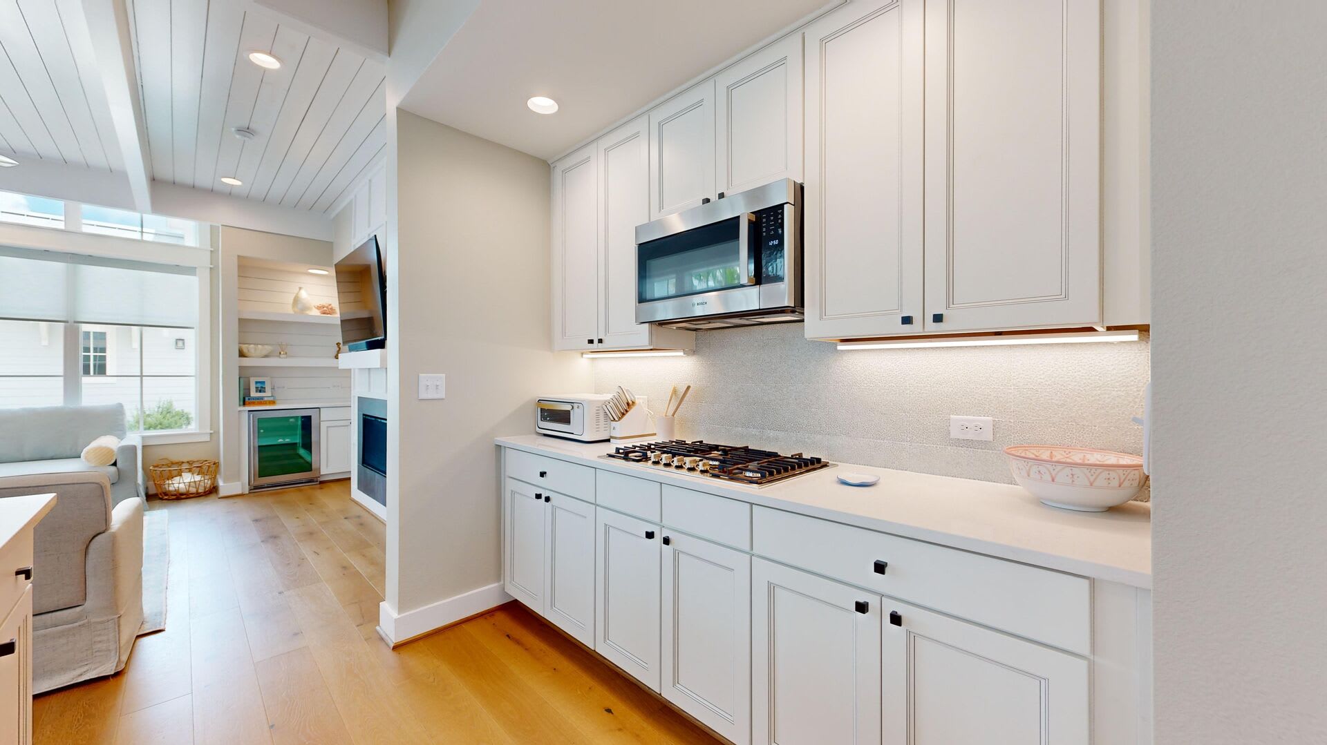 The culinary enthusiast will appreciate the fully stocked kitchen, equipped with top-of-the-line stainless Bosch appliances. From the microwave, convection oven, and griddle to the blender, pressure cooker, toaster, and wine/beverage fridge, this kitchen has everything you need to whip up delicious meals. Step outside to the spacious patio, where you can savor dinner under the stars on the dining table and chairs or unwind in the outdoor lounge chairs while soaking up the Port A sunshine. A convenient half bath completes this level for added comfort.