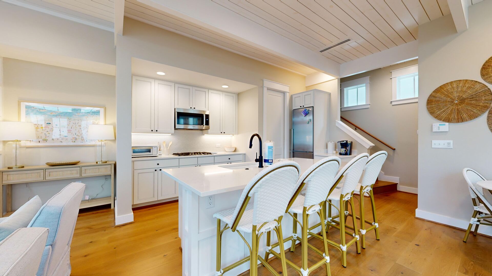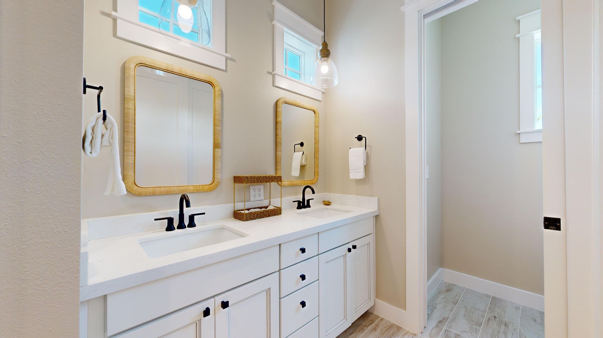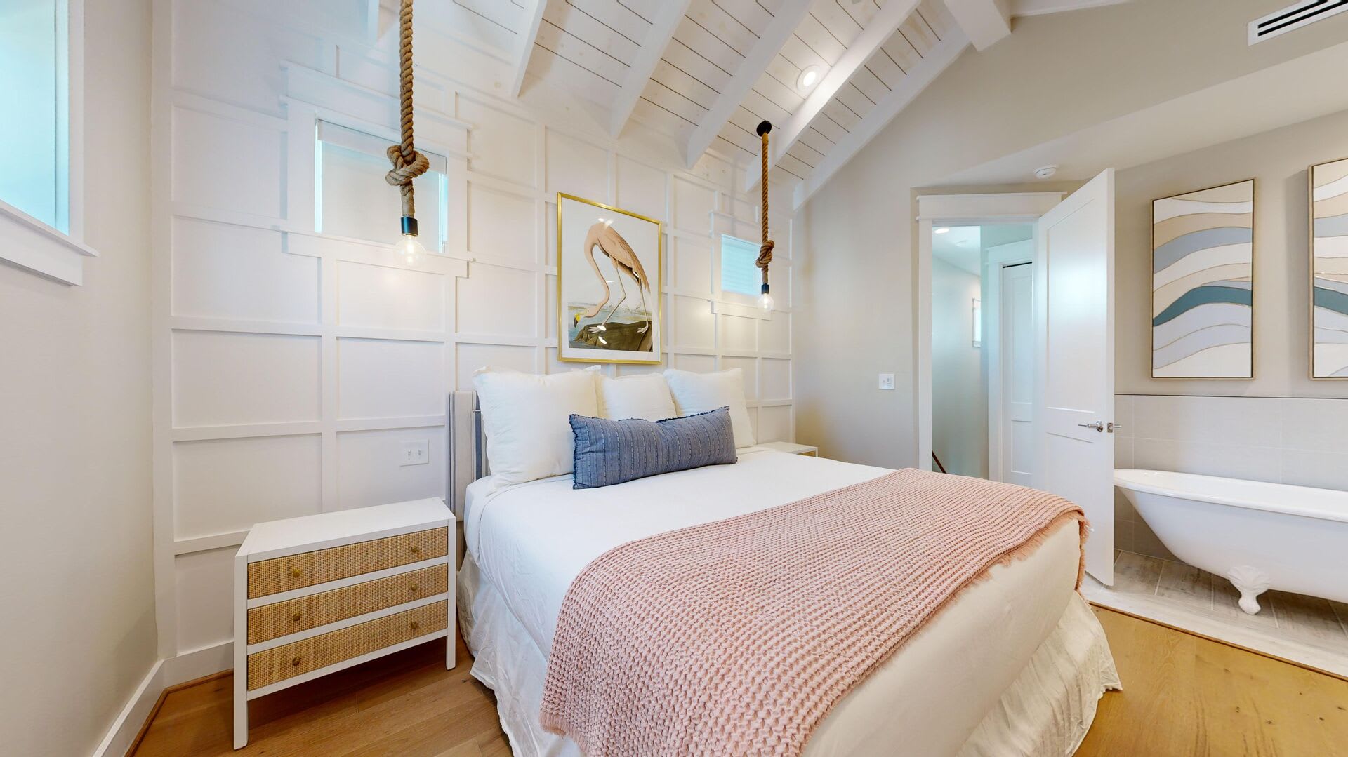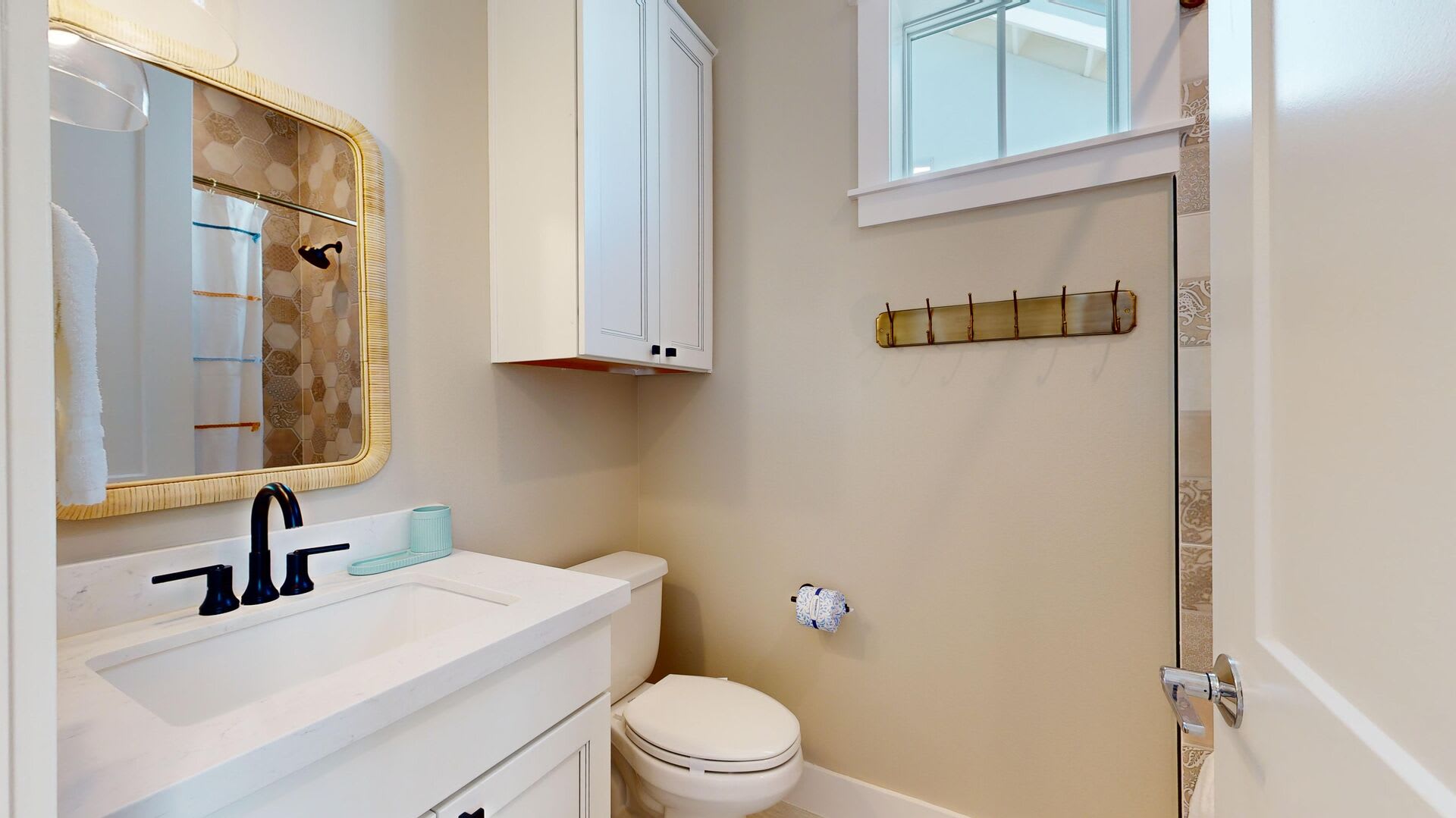 Venture to the second level, where you'll discover two spacious full-size bedrooms, each featuring its own ensuite bath for added privacy and comfort. While the home offers plenty of outdoor hangout areas, the upstairs patio is not part of the guest-accessible spaces and will need to remain locked. A stackable washer and dryer on this level ensures that you can effortlessly keep your beachwear fresh throughout your stay.