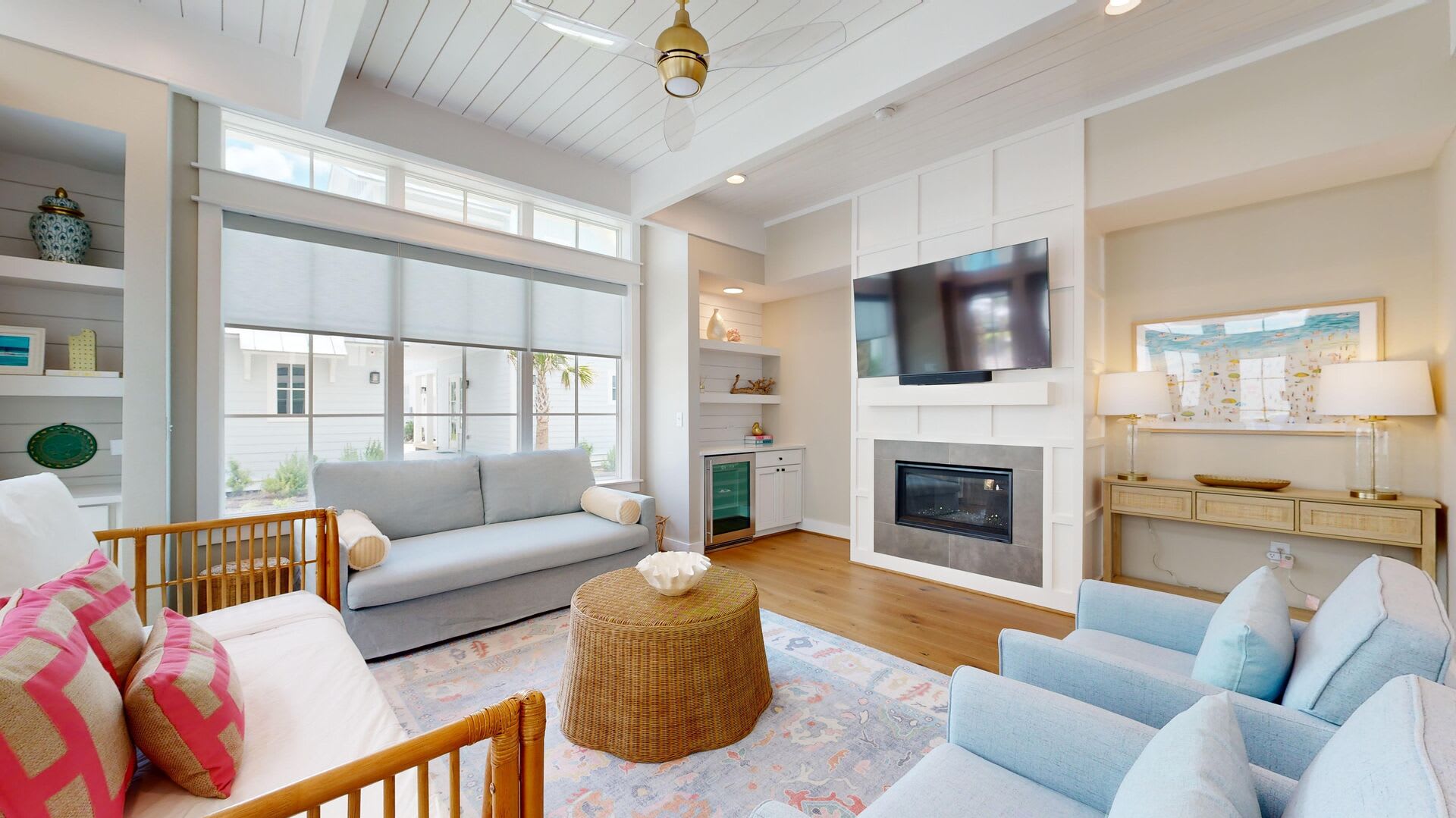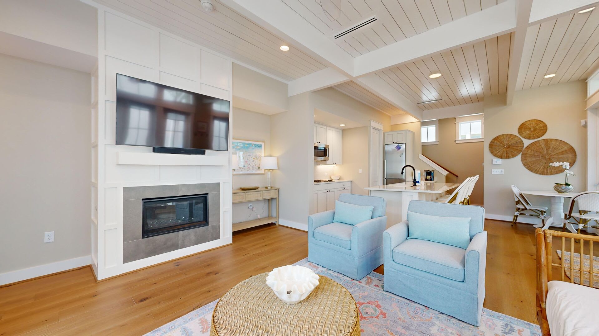 As you enter the first level, you'll be greeted by a cozy living area adorned with a decorative fireplace, perfect for setting the mood during your stay. Enjoy movie nights or catch the big game on the smart TV, enhanced by Sonos speakers for an immersive sound experience. The space offers ample seating, including a comfortable sofa that conveniently folds out into a queen bed, along with a cozy twin daybed.