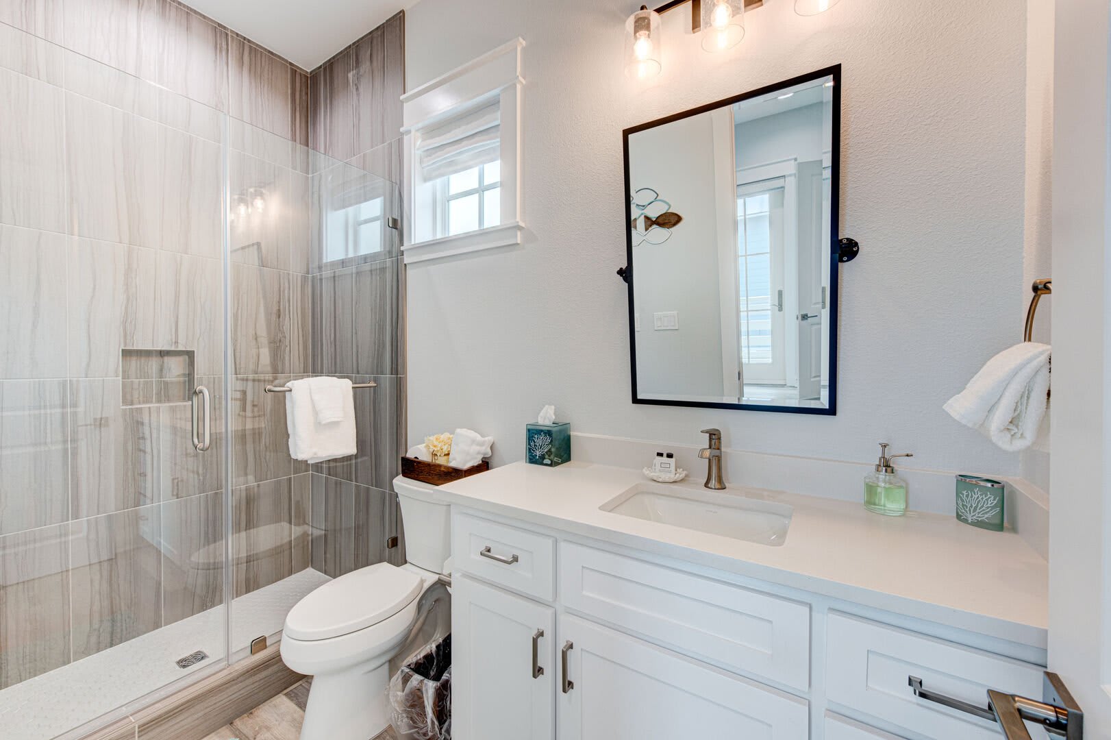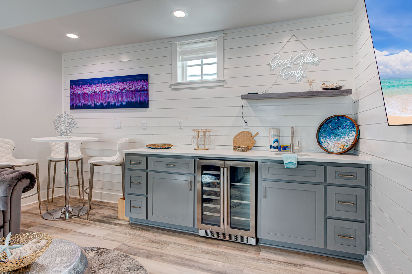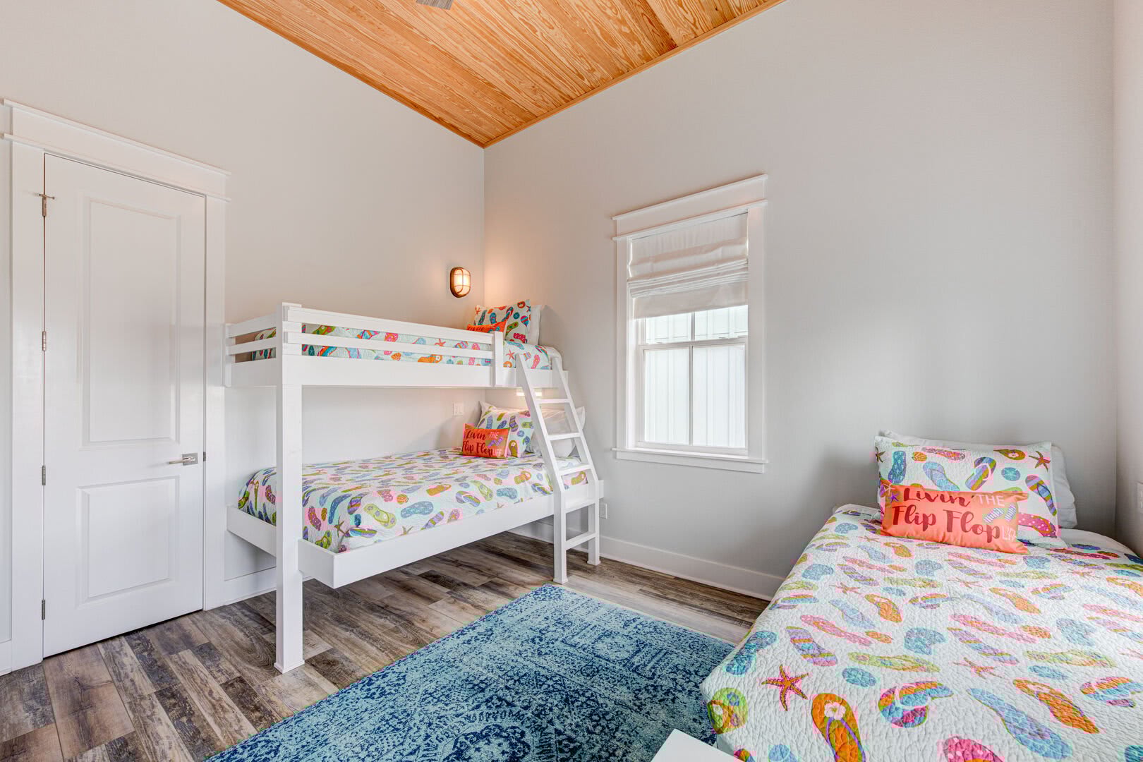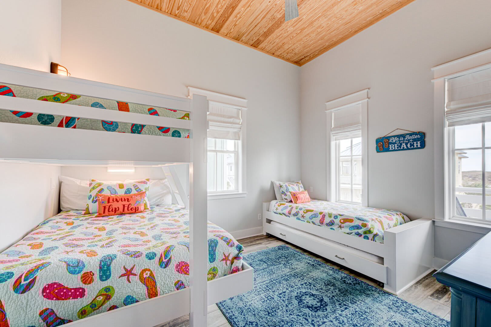The Blue Flamingo has four gorgeous bedrooms to choose from. The primary suite is located on the main floor and features a sumptuous queen-size bed, large flat screen TV and ensuite bathroom. You’ll love the spa-like experience of the primary bathroom with dual sinks and a beautifully tiled, oversized shower. You’ll find the in-house washer and dryer tucked away in the primary bathroom, making it easy to refresh your swimsuit at the end of the day. Upstairs, three more bedrooms await your guests with cozy bedding and comfortable mattresses. Discover a queen-size bed in the ensuite second bedroom and a full-size bed in the third bedroom. Perfect for kids to camp out, the fourth bedroom is outfitted with a twin-over-full bunk bed and a twin-size bed with a twin-size pull-out trundle. A third full bathroom and convenient half-bathroom are stocked with plenty of fluffy towels and give guests a place to freshen up.