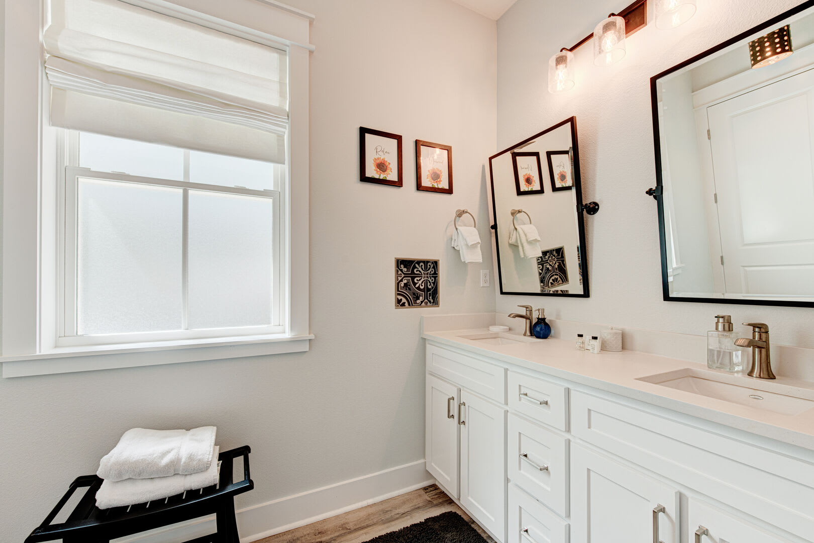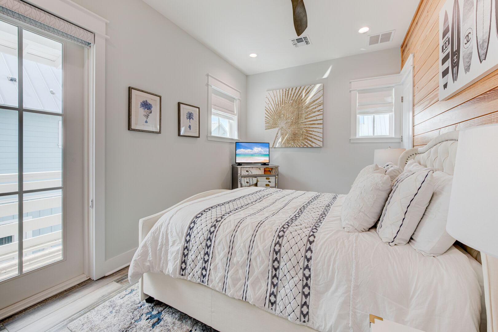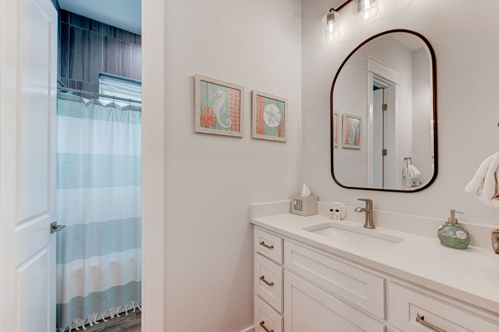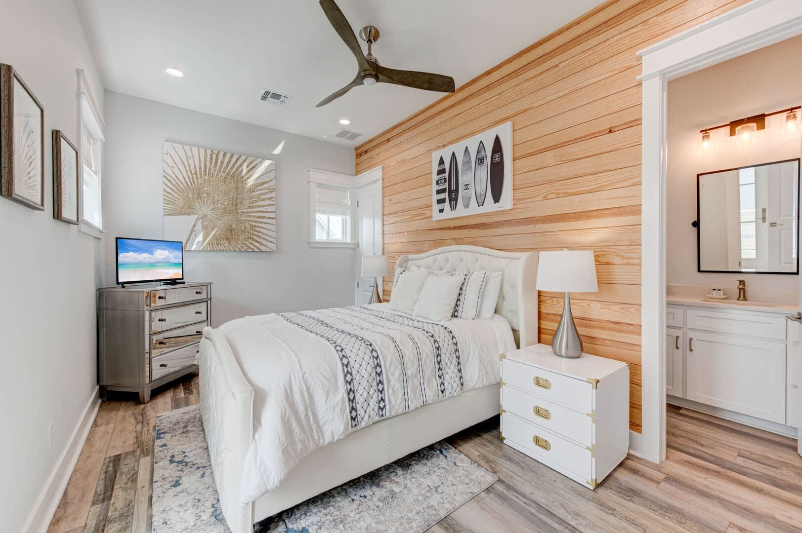 The Blue Flamingo has four gorgeous bedrooms to choose from. The primary suite is located on the main floor and features a sumptuous queen-size bed, large flat screen TV and ensuite bathroom. You’ll love the spa-like experience of the primary bathroom with dual sinks and a beautifully tiled, oversized shower. You’ll find the in-house washer and dryer tucked away in the primary bathroom, making it easy to refresh your swimsuit at the end of the day. Upstairs, three more bedrooms await your guests with cozy bedding and comfortable mattresses. Discover a queen-size bed in the ensuite second bedroom and a full-size bed in the third bedroom. Perfect for kids to camp out, the fourth bedroom is outfitted with a twin-over-full bunk bed and a twin-size bed with a twin-size pull-out trundle. A third full bathroom and convenient half-bathroom are stocked with plenty of fluffy towels and give guests a place to freshen up.