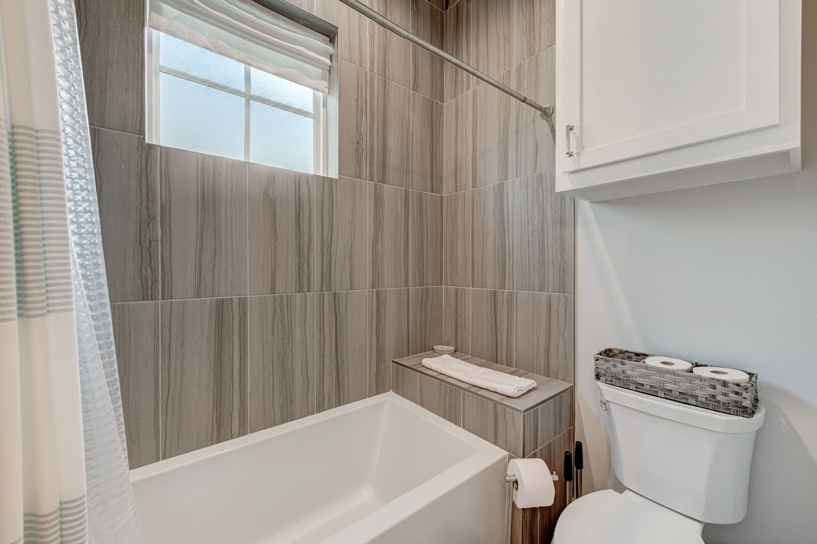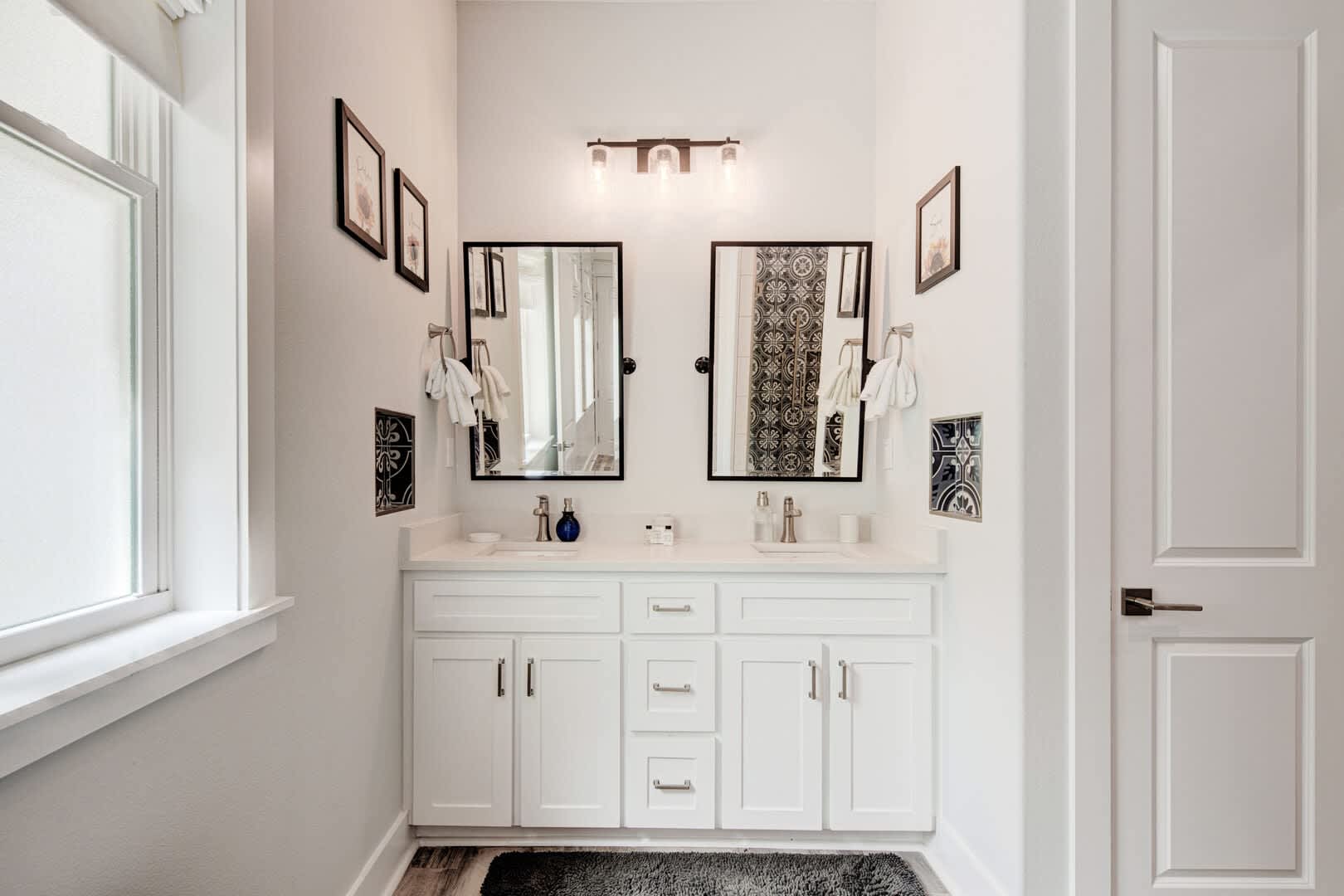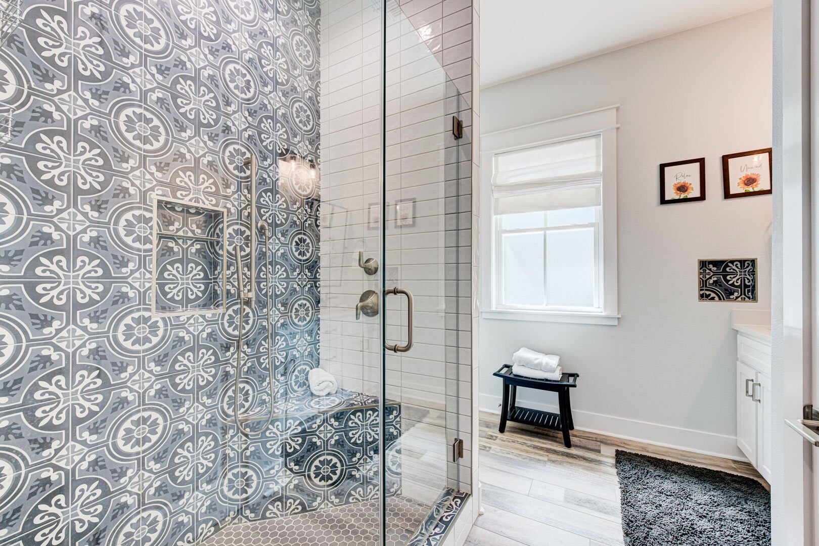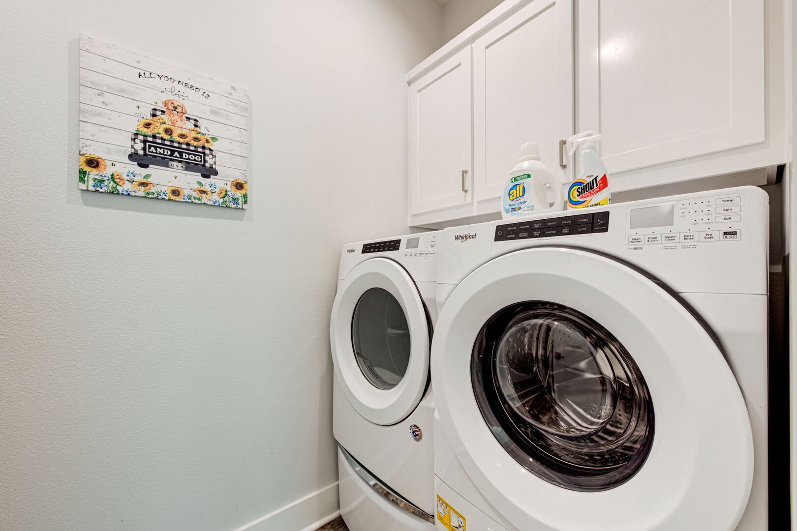 The Blue Flamingo has four gorgeous bedrooms to choose from. The primary suite is located on the main floor and features a sumptuous queen-size bed, large flat screen TV and ensuite bathroom. You’ll love the spa-like experience of the primary bathroom with dual sinks and a beautifully tiled, oversized shower. You’ll find the in-house washer and dryer tucked away in the primary bathroom, making it easy to refresh your swimsuit at the end of the day. Upstairs, three more bedrooms await your guests with cozy bedding and comfortable mattresses. Discover a queen-size bed in the ensuite second bedroom and a full-size bed in the third bedroom. Perfect for kids to camp out, the fourth bedroom is outfitted with a twin-over-full bunk bed and a twin-size bed with a twin-size pull-out trundle. A third full bathroom and convenient half-bathroom are stocked with plenty of fluffy towels and give guests a place to freshen up.