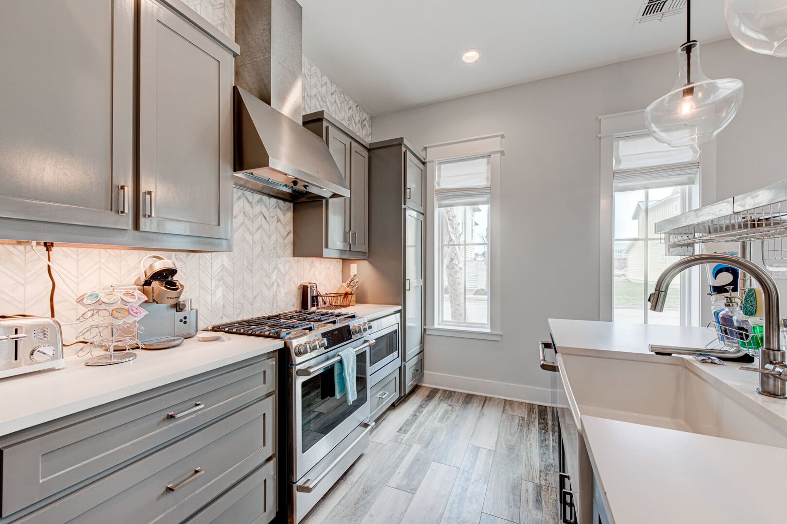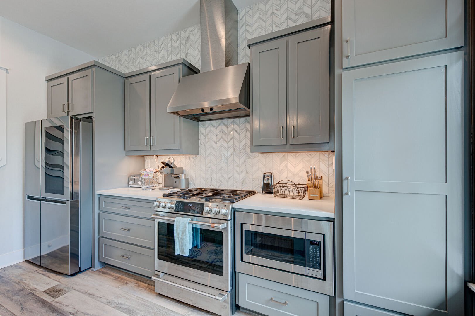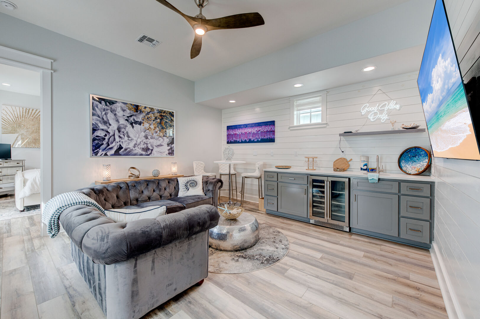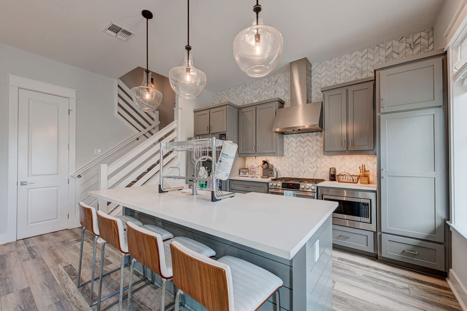Step inside to discover luxury details, plush furnishings and a spacious design that lets everyone spend time together while allowing for plenty of space to sprawl out. You’ll immediately notice the gourmet kitchen. When you aren’t out on the town savoring a delicious seafood dinner at one of Port A’s restaurants, you’ll have this stunning kitchen right at your fingertips. Stainless-steel appliances, a gas range and a working kitchen island make light of any recipe in your arsenal. All you need to bring along are the ingredients! Dine together at the glass-topped sculpture table or head outside and catch the sunset for an Alfresco dinner experience. After dinner, gather on the plush, blue velvet-wrapped sofa for a movie or game night, or head upstairs to the second living room where you’ll find a wet bar with a perfect-temp wine fridge just waiting for you to pour a nightcap. Enjoy it on the balcony, under a Texas sky full of twinkling stars.