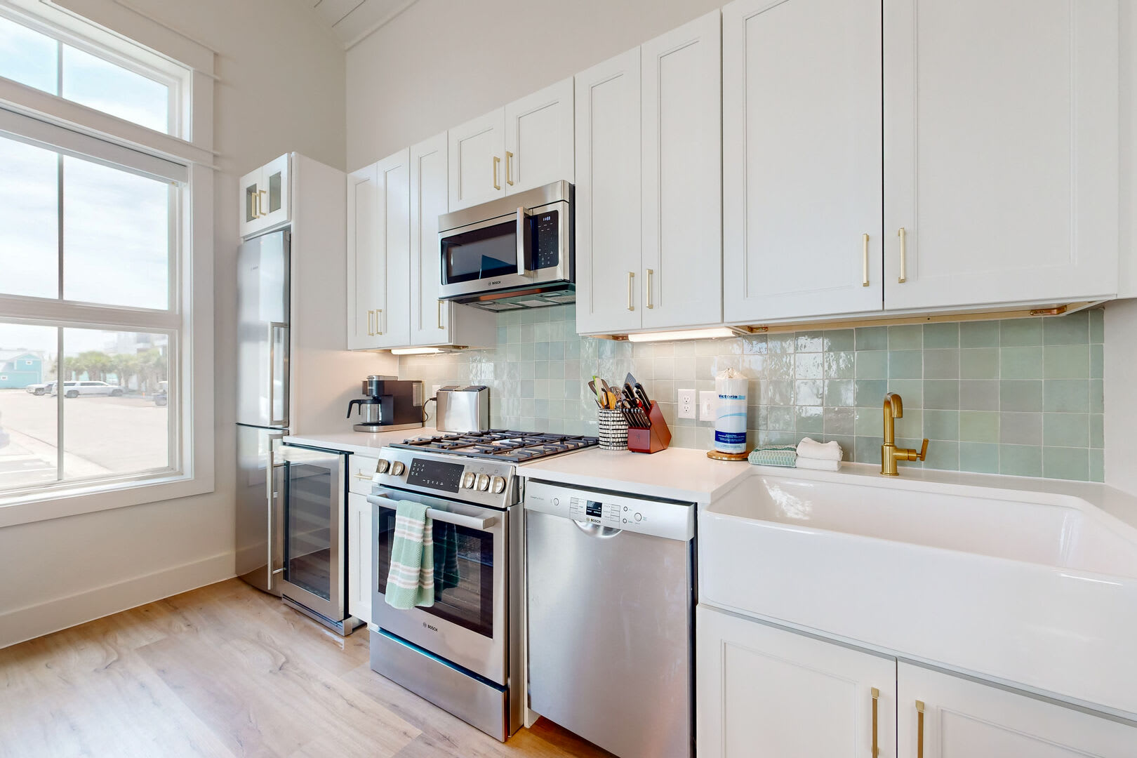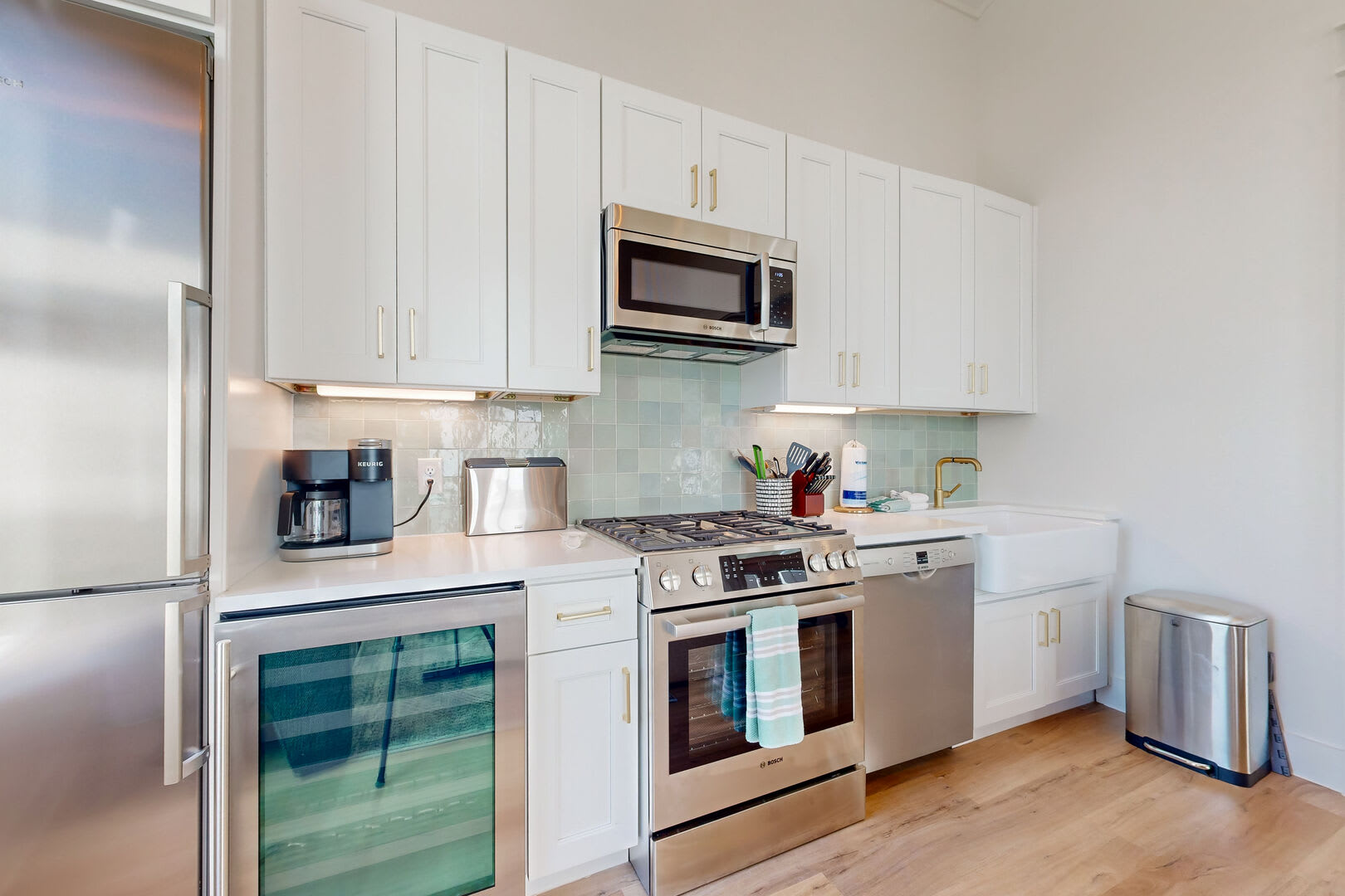 Beautiful modern kitchen, cook up a storm with Bosch stainless steel appliances, including a wine/beverage fridge for your favorite refreshments. Enjoy outdoor bliss and bask in the Port A sunshine on your private patio, complete with a table and chairs for family dining and relaxation.