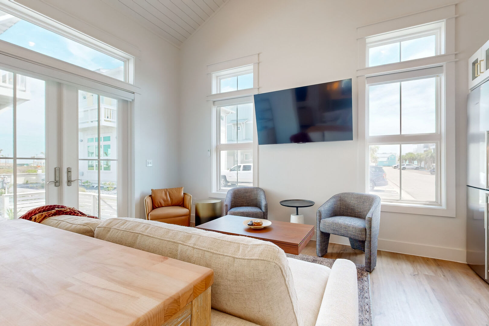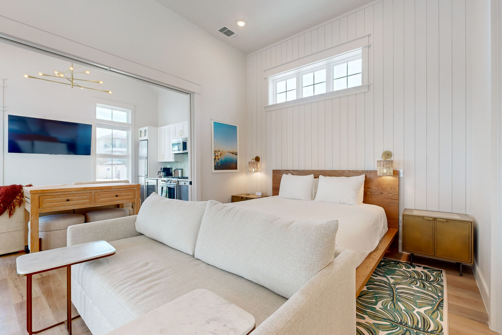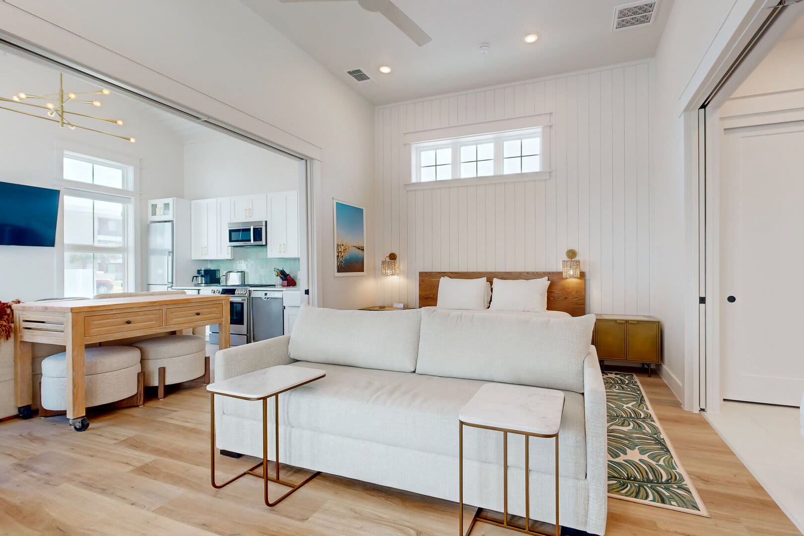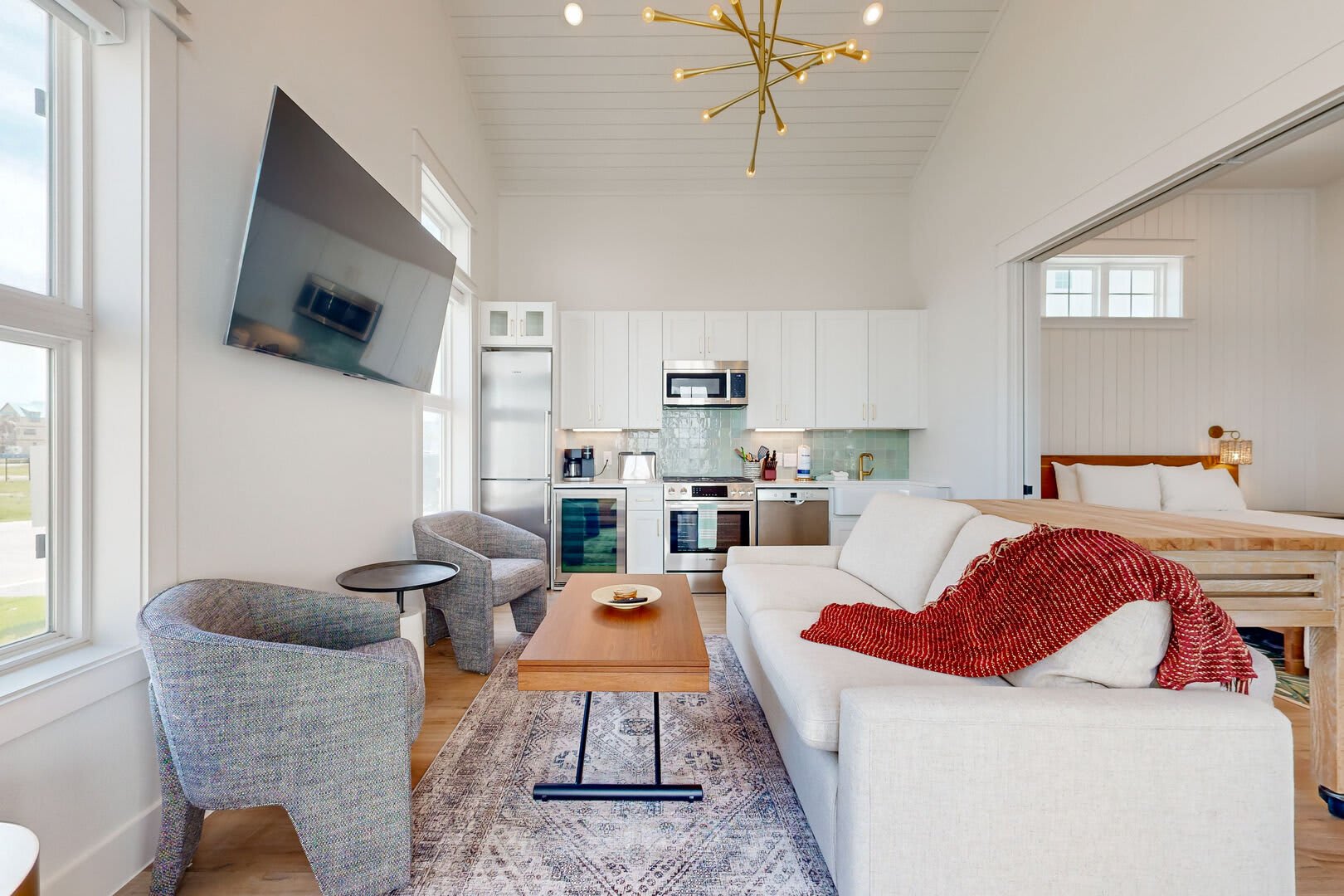 Open concept living, enjoy the spacious first level with a studio-style layout and a pocket sliding door that seamlessly separates the master bedroom from the living and kitchen areas.