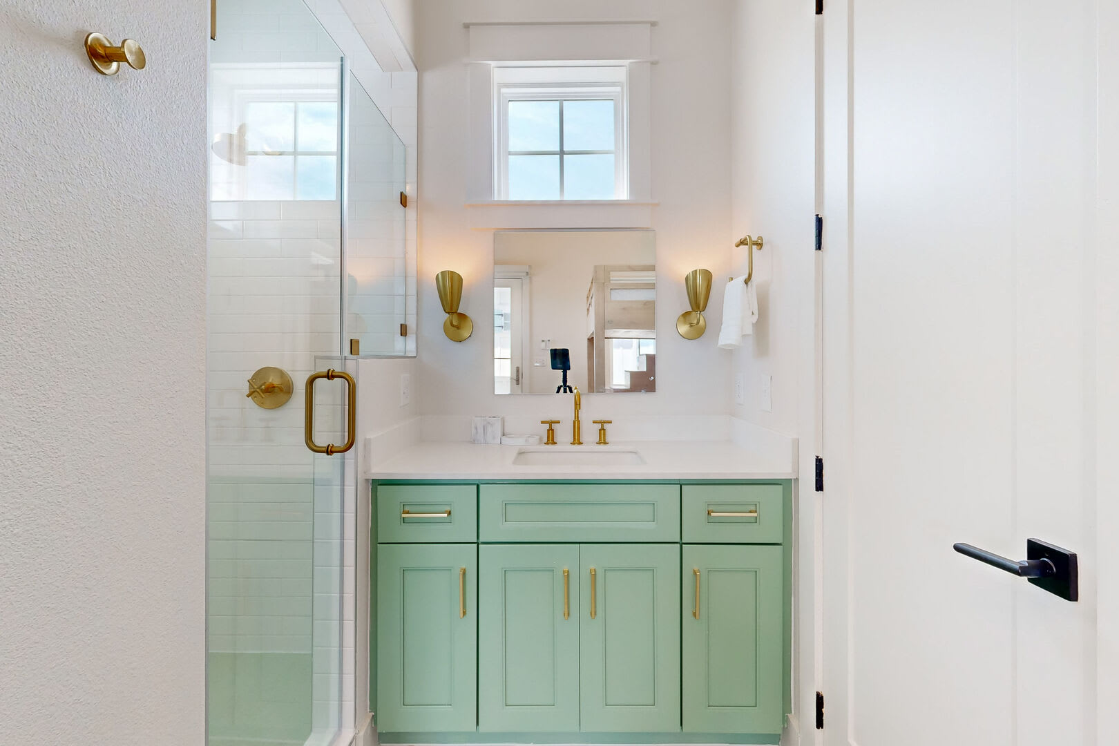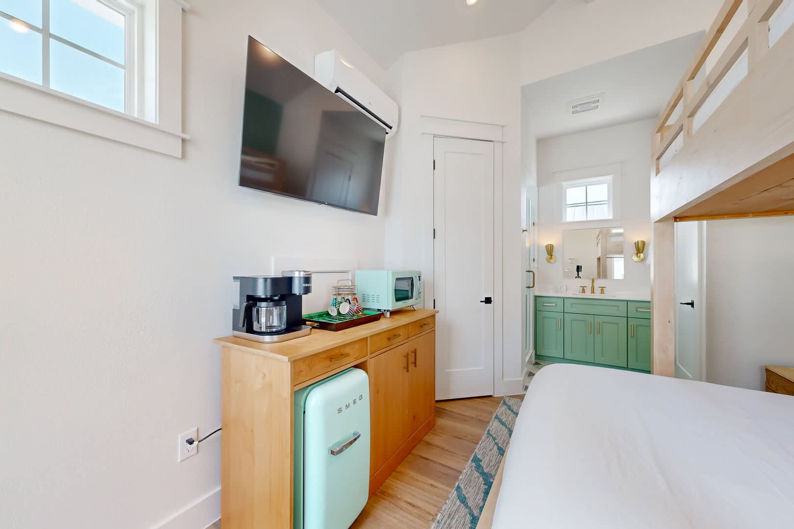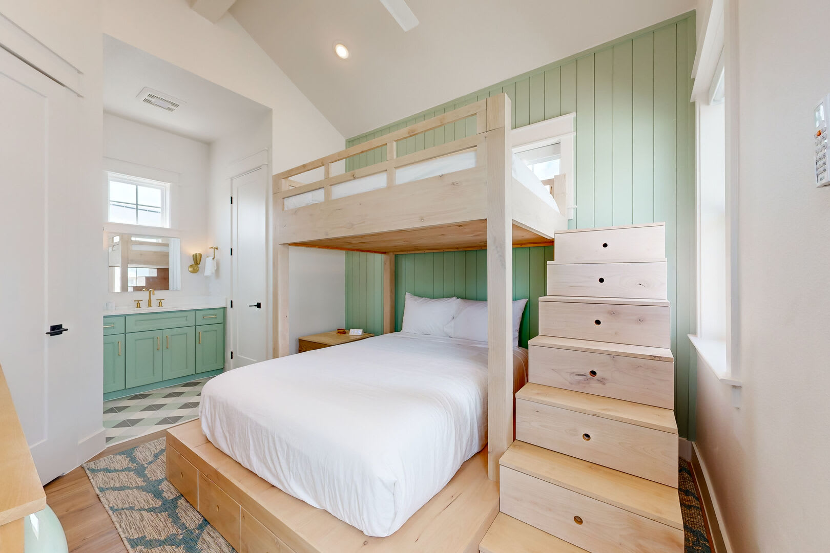 BR2 Bunk Full over Queen, TV, ensuite bath w/ walk-in shower, single vanity (this bedroom has to be accessed from the outdoor patio stairs)