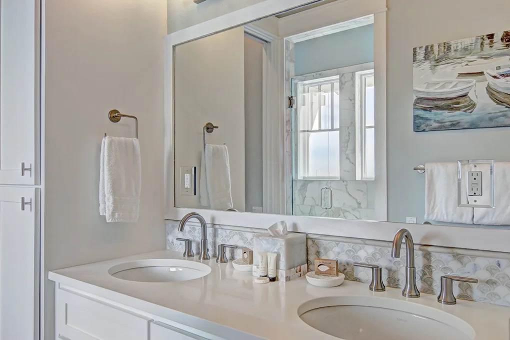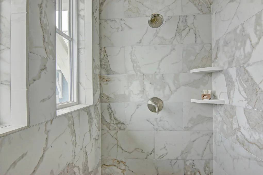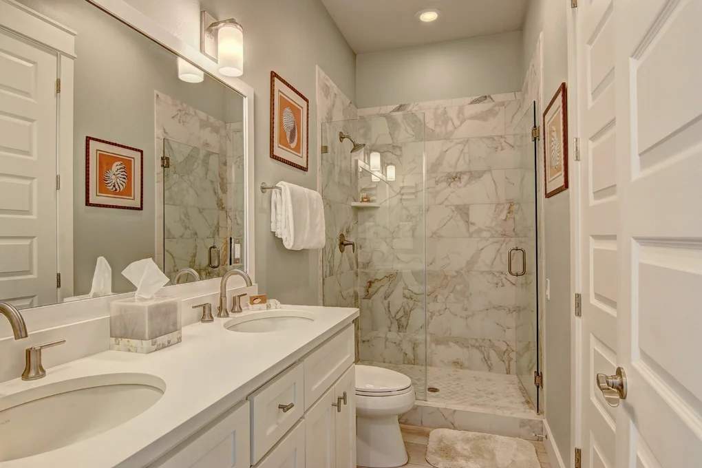 Two full bathrooms are easy for guests to share downstairs. A full bathroom with a double vanity and walk-in shower is accessible via the third bedroom. An additional full bathroom with a tub/shower combination on the first floor is convenient to the courtyard.