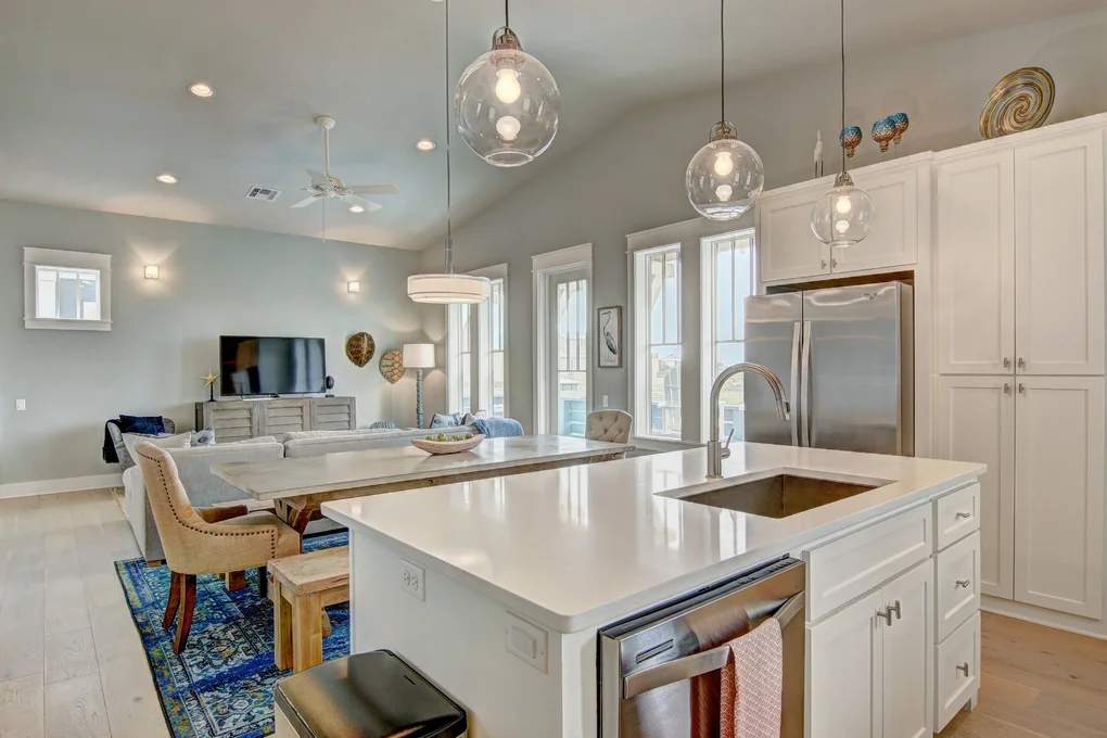 The second-floor living area is stunning. We absolutely loved cooking in the gourmet kitchen—the high-quality stainless steel appliances, Cephalon pans, and beautiful dishes made entertaining a breeze. The adjacent dining table was perfect, and the wine fridge was a huge plus!