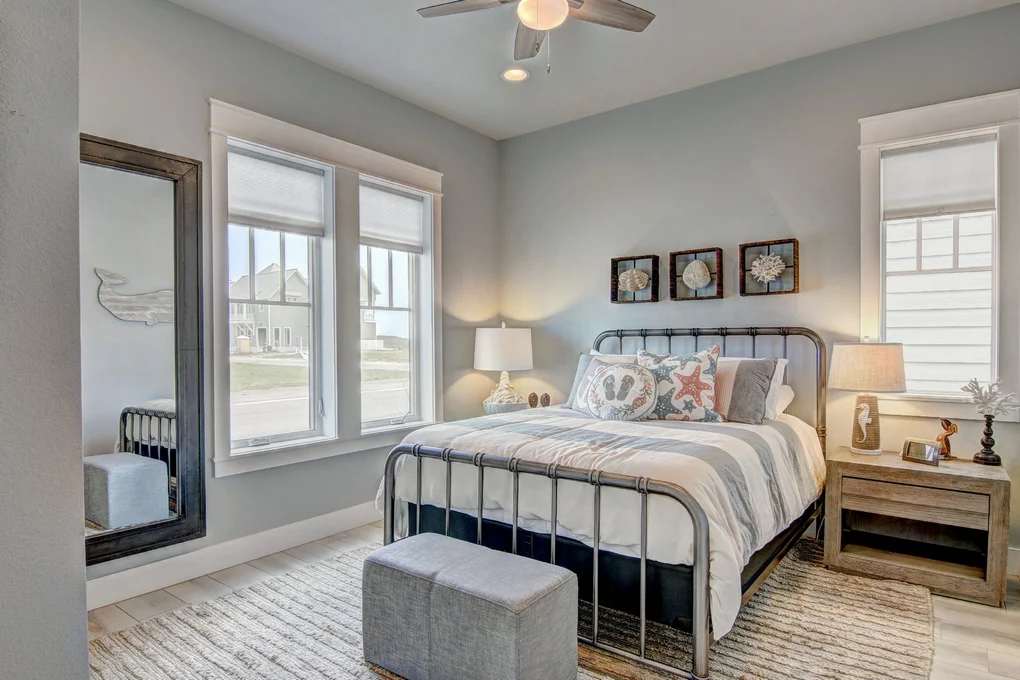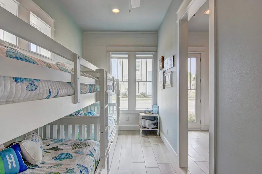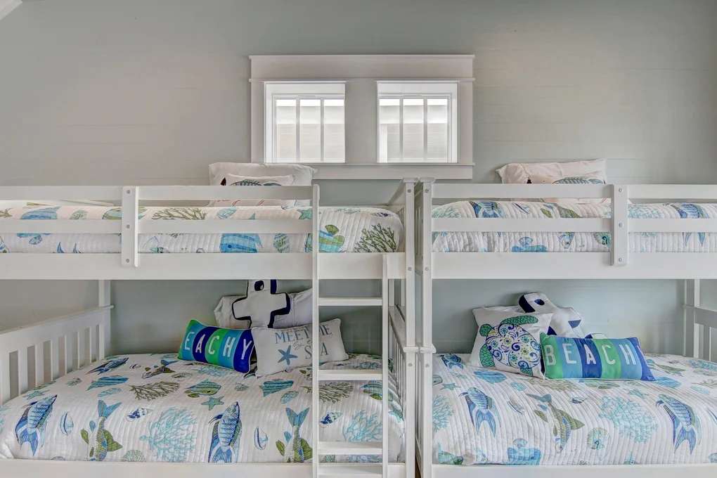 Located on the first (ground) floor: There are two beautifully appointed guest rooms that include comfortable queen beds and roomy closets; while the fourth bedroom has two twin-over-twin bunk beds with plenty of room for kids to sleep.