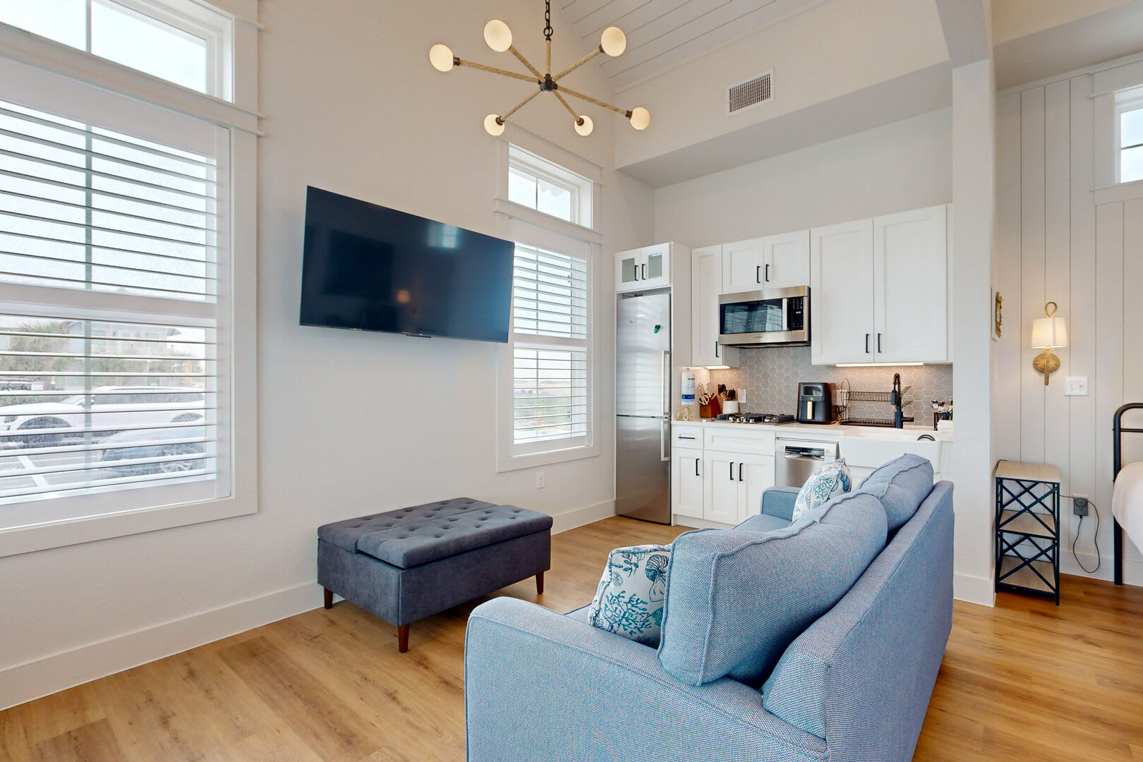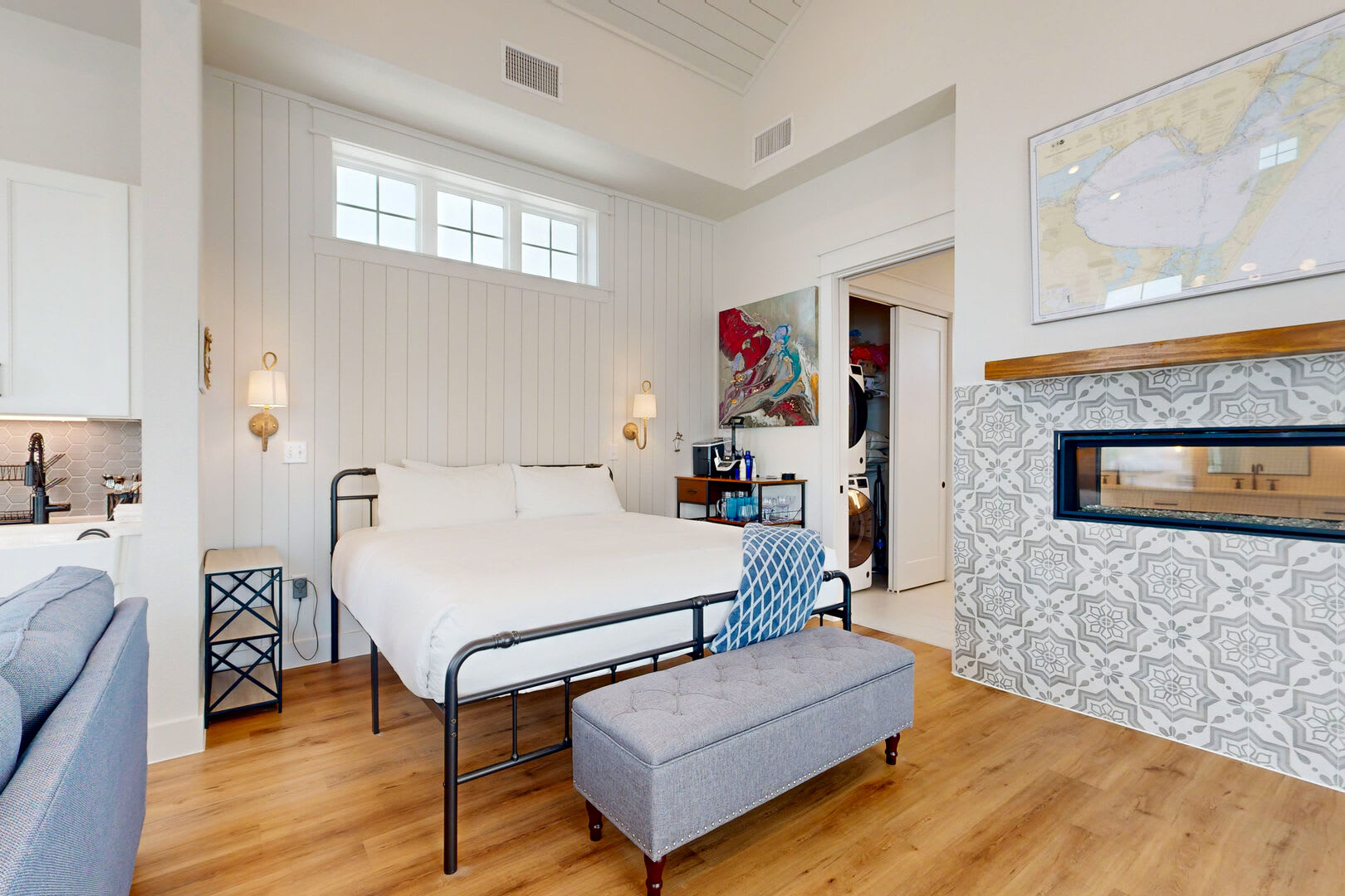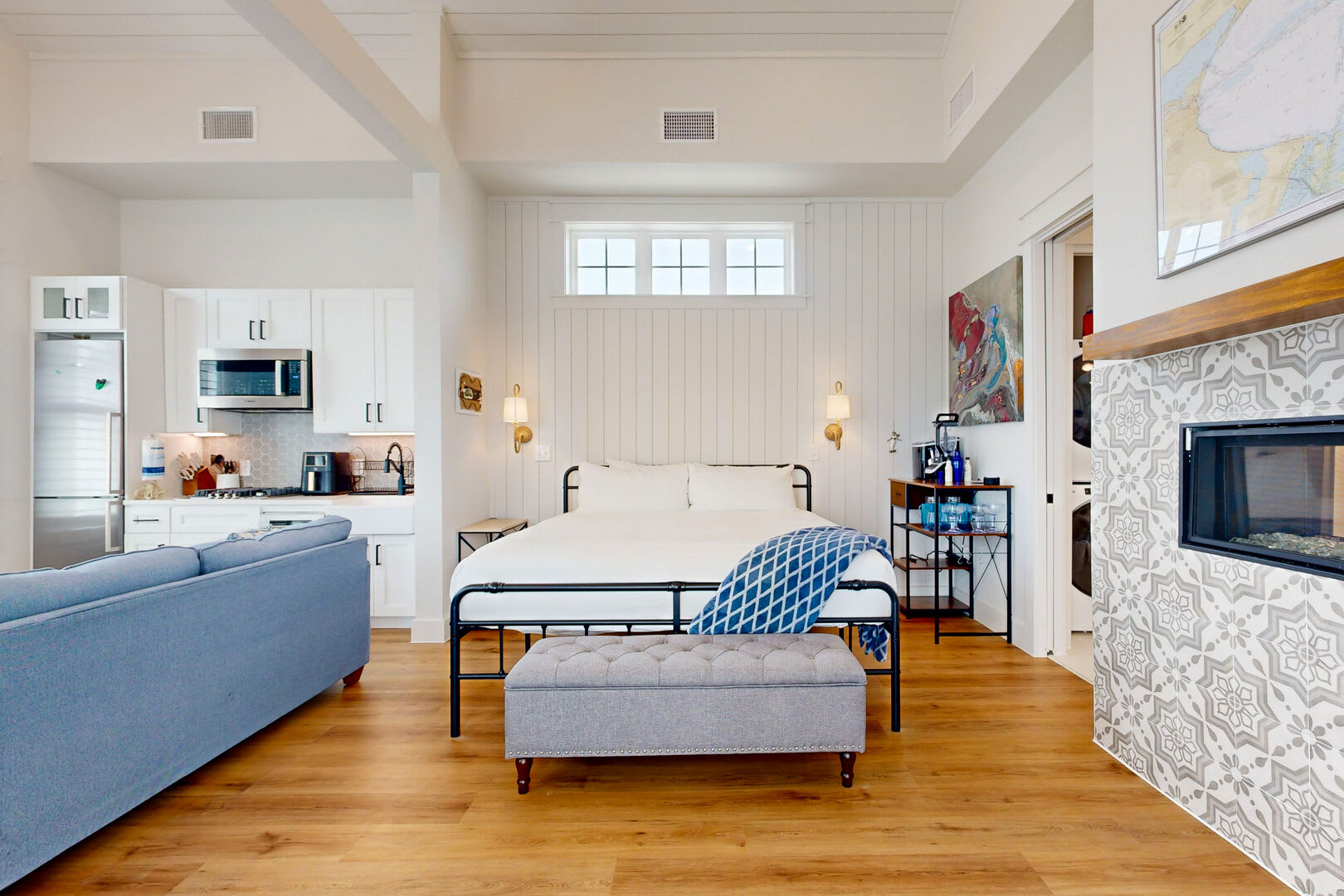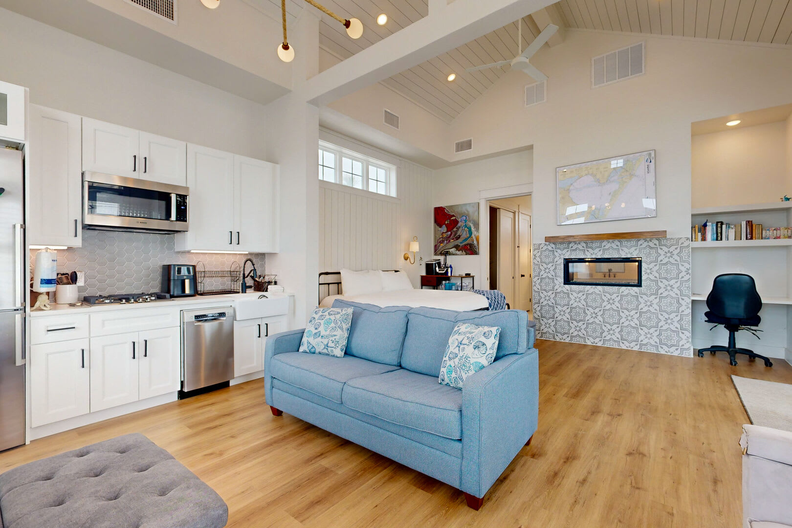 This charming studio hideaway comfortably sleeps four and boasts an open floor plan designed for relaxation and comfort. The kitchenette is equipped with top-of-the-line stainless Bosch appliances, including a gas cooktop, dishwasher, microwave, fridge, and a farmhouse sink, making meal preparation a breeze.
